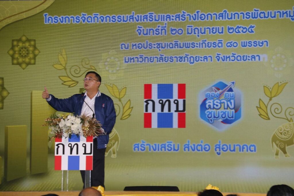 วันที่ 20 มิถุนายน 2565 เวลา 09.30 น. ณ หอประชุมเฉลิมพระเกียรติ 80 พรรษามหาวิทยาลัยราชภัฏยะลา จังหวัดยะลา นายอนุชา นาคาศัย รัฐมนตรีประจำสำนักนายกรัฐมนตรี เป็นประธานเปิดโครงการจัดกิจกรรมส่งเสริมและสร้างโอกาสในการพัฒนาหมู่บ้านและชุมชน ซึ่งจัดโดยสำนักงานกองทุนหมู่บ้านและชุมชนเมืองแห่งชาติ โดยมี นายธีรุตม์ ศุภวิบูลย์ผล รองผู้ว่าราชการจังหวัดยะลา,นายธัชชญาณ์ณัช เจียรธนัทกานนท์ เลขานุการรัฐมนตรีประจำสำนักนายกรัฐมนตรี,นายอาดิลัน อาลีอิสเฮาะ ส.ส.ยะลา เขต 1,นายพยม พรหมเพชร ส.ส.สงขลา เขต 3 นายกามิน มุซิ ว่าที่ผู้สมัคร ส.ส.ยะลา เขต 3,นายเบญจพล นาคประเสริฐ ผู้อํานวยการสำนักงานกองทุนหมู่บ้านและชุมชนเมืองแห่งชาติ,นายชนธัญ แสงพุ่ม รองเลขาธิการศูนย์อำนวยการบริหารจังหวัดชายแดนภาคใต้ (ศอ.บต.) และสมาชิกกองทุนหมู่บ้านเมืองเข้าร่วมในพิธี