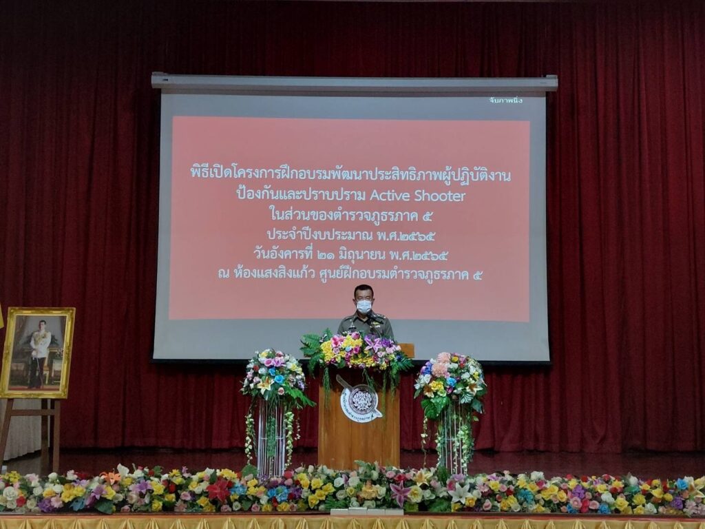 พล.ต.อ.สุวัฒน์ แจ้งยอดสุข ผบ.ตร. ได้มอบหมายให้ พล.ต.ท.ปิยะ ต๊ะวิชัย ผบช.ภ.5 เป็นประธานพิธีเปิดโครงการฝึกอบรมพัฒนาประสิทธิภาพผู้ปฏิบัติงานป้องกันและปราบปราม Active Shooter ในส่วนของตำรวจภูธรภาค5 ประจำปีงบประมาณ พ.ศ.2565 ณ ห้องแสงสิงแก้ว ศูนย์ฝึกอบรมตำรวจภูธรภาค5 อ.ห้างฉัตร จว.ลำปาง