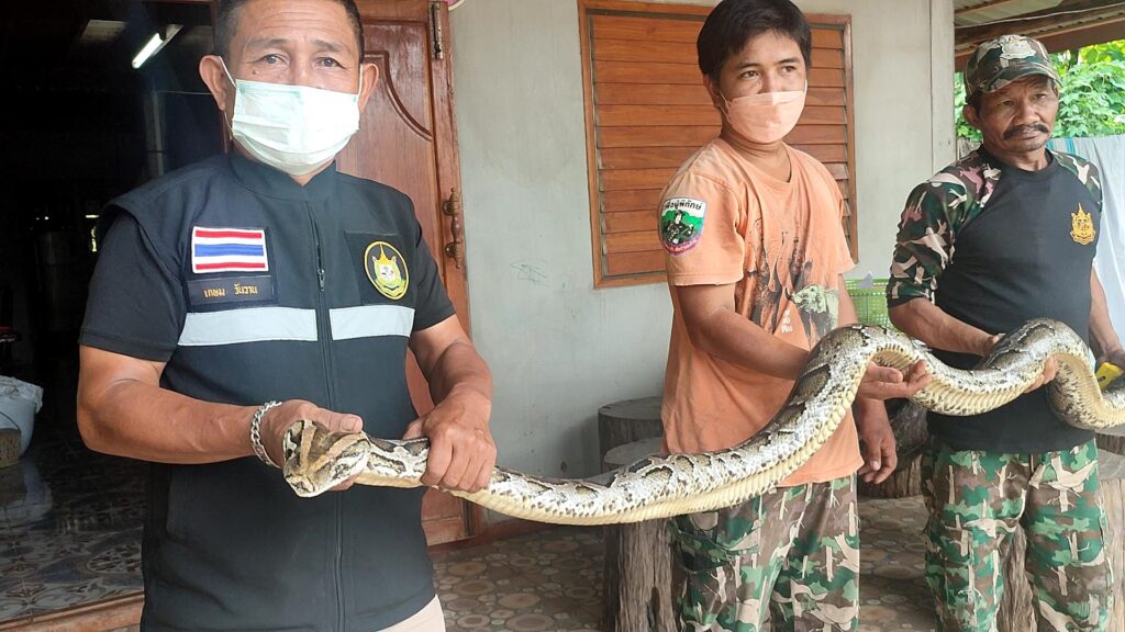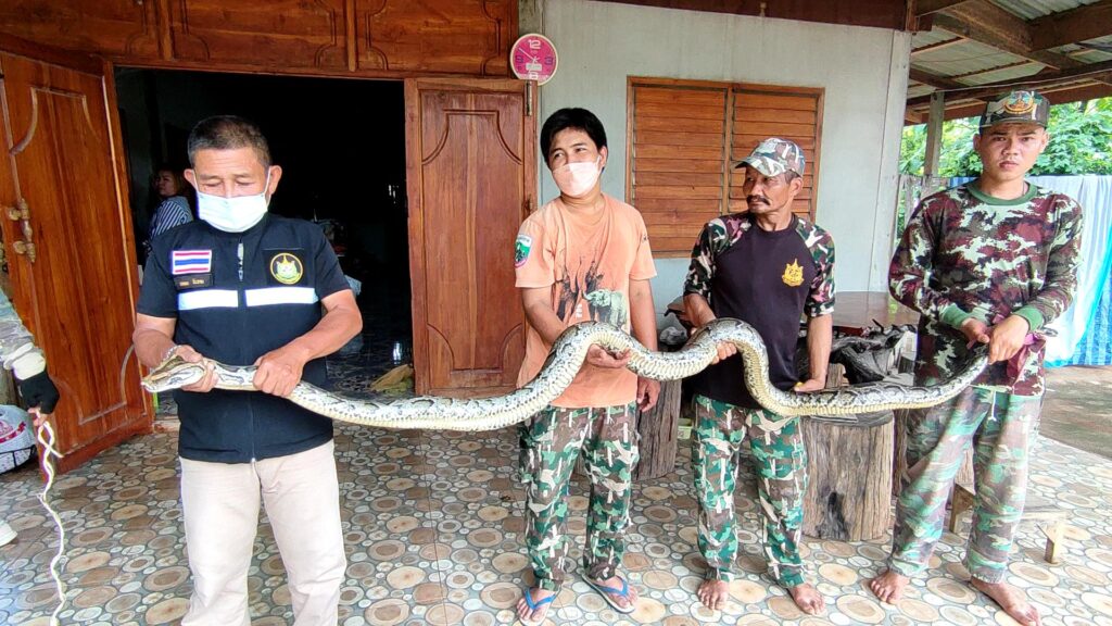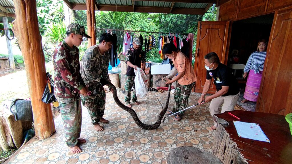 เมื่อเจ้าหน้าที่เขตห้ามล่าสัตว์ป่าวังโป่ง-ชนแดน เดินทางมาถึงบ้านหลังดังกล่าว พบว่าเป็นบ้านสองชั้น ครึ่งปูนครึ่งไม้ โดยเจ้าของบ้าน ได้แจ้งว่างูยังคงซ่อนตัวอยู่ในห้องครัว จึงกันผู้ไม่เกี่ยวข้องให้ออกห่าง จากนั้นได้ช่วยกันค้นหาเพียงไม่นาน ก็พบงูตัวดังกล่าว ขดตัวอยู่ใกล้กับกล่องเก็บของ เมื่อเห็นเจ้าหน้าที่ งูได้แสดงอาการดุร้าย และพยายามฉกกัดทันที เจ้าหน้าที่ต้องใช้ความระวัง ก่อนใช้อุปกรณ์คล้องคองู นำตัวออกมาด้านนอกได้สำเร็จ ตรวจสอบพบว่าเป็นงูเหลือมขนาดใหญ่ ลำตัวยาว 3.50 เมตร จึงช่วยกันจับใส่ถุงปุ๋ย เพื่อนำไปปล่อยในป่า คืนสู่ธรรมชาติต่อไป