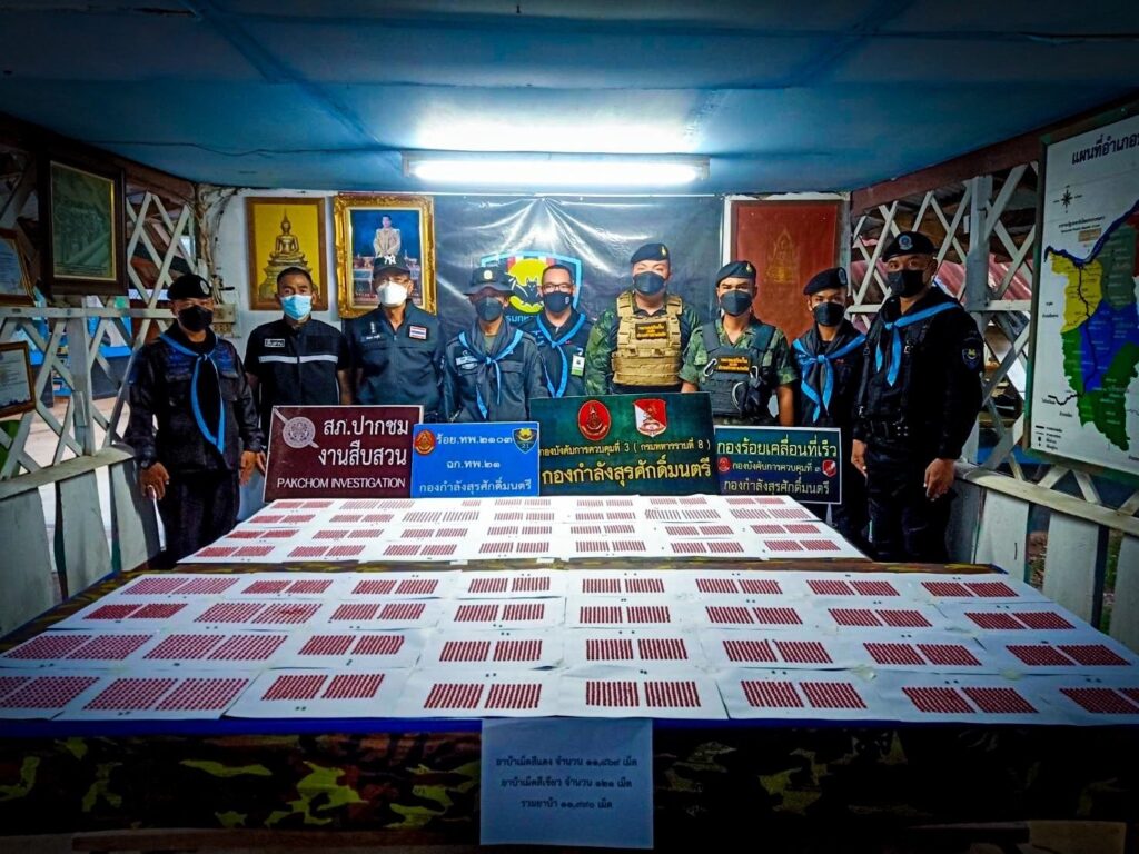 วันที่ 19 มิ.ย.2565 ผู้สื่อข่าวรายงานว่ากองกำลังสุรศักดิ์มนตรี โดย หน่วยเฉพาะกิจกรมทหารพรานที่ 21 ภายใต้การอำนวยการของ พล.ต.ณรงค์ สวนแก้ว ผบ.พล.ร.3/ผบ.กกล.สุรศักดิ์มนตรี, พ.อ.ณรงค์ วิชญาณวรวุฒิ ผบ.บก.ควบคุมที่ 3 ( ร.8 ) และพ.อ.อุทัย นิลเนตร ผบ.กรม ทพ.21/ผบ.ฉก.ทพ.21 จากการบูรณาการด้านการข่าวในพื้นที่ อ.ปากชม จ.เลย ได้รับแจ้งจากแหล่งข่าวว่าจะมีการลำเลียงยาเสพติดเข้ามาในพื้นที่บริเวณบ้านหาดเบี้ย ม.7 ต.ปากชม อ.ปากชม จ.เลย จึงได้สั่งการให้กองร้อยทหารพรานที่ 2103 หน่วยเฉพาะกิจกรมทหารพรานที่ 21 บูรณาการกำลัง 3 ฝ่ายทำการลาดตระเวนซุ่มเฝ้าตรวจ เมื่อเวลา 1400 น.ได้สังเกตุ ชาย 2 คน ขับเรือแล่นมาจากฝั่ง สปป.ลาว และเข้าจอดเทียบท่าแลได้ถือถึงพาสติกสีชมพู มาวางไว้บริเวณโพรงหญ้าลักษณะต้องสงสัย ชป.จึงได้แสดงตัวเข้าตรวจสอบ เมื่อชายดังกล่าวได้เห็นเป็น จนท.ได้แสดงอาการตกใจได้วิ่งลงน้ำและว่ายน้ำข้ามไปยังฝั่ง สปป.ลาว จนท.จึงได้เข้าพิสูจน์ทราบตรวพบเป็นยาเสพติด(ยาบ้า) จำนวน 2 มัดใหญ่ ประมาณ 12,000 เม็ด ขั้นต้นของกลางทั้งหมดจะนำมาตรวจนับที่ บก.ร้อย.ทพ.2103 เพื่อแจ้งหน่วยงานความมั่นคงร่วมตรวจนับของกลางทั้งหมดเตรียมส่งมอบให้ ส่งพนักงานสอบสวน สภ.ปากชมเพื่อดำเนินการตามกฎหมายต่อไป