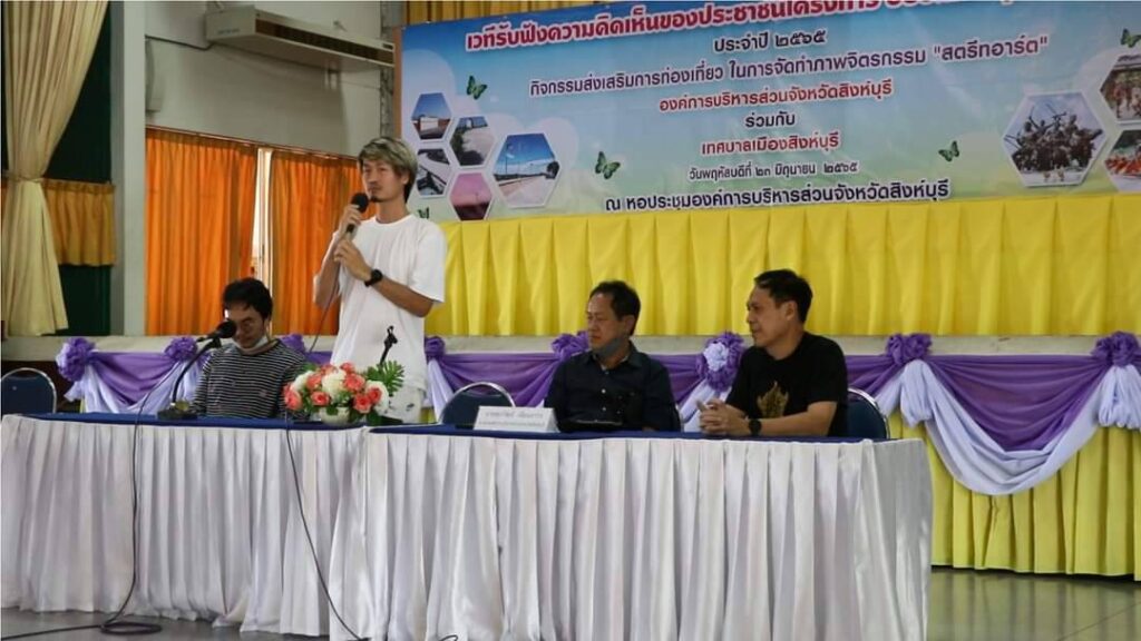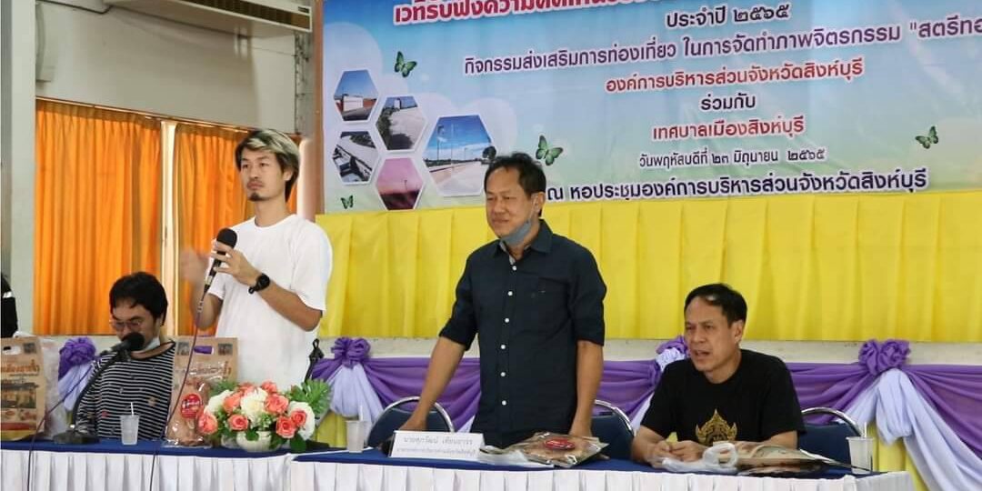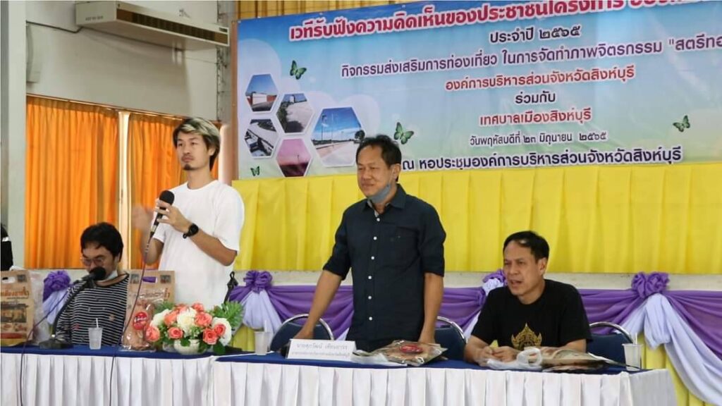 นายศุภวัฒน์ เทียนถาวร นายกองค์การบริหารส่วนจังหวัดสิงห์บุรี ร่วมกับ เทศบาลเมืองสิงห์บุรี จัดเวทีรับฟังความคิดเห็นของประชาชน ณ หอประชุมองค์การบริหารส่วนจังหวัดสิงห์บุรี โดยมี ส่วนราชการ เอกชน ผู้นำชุมชน และประชาชนจังหวัดสิงห์บุรี ร่วมประชุมเสนอความคิดเห็นและมุมต่างๆ ในการจัดทำภาพจิตรกรรมฝาผนัง”สตรีทอาร์ต”บริเวณแนวเขื่อนกั้นน้ำริมแม่น้ำเจ้าพระยา ตั้งแต่สะพานบางระจันถึงสะพานอนุสรณ์ 100 ปีสิงห์บุรี (สะพานหลวงพ่อแพ 89) โดยมีวัตถุประสงค์เพื่อสื่อสารกับนักท่องเที่ยวเกี่ยวกับเรื่องราวของวัฒนธรรมความเป็นอยู่ วิถีชีวิต ของดีเมืองสิงห์ และประวัติศาตร์ความเป็นมาของจังหวัดสิงห์บุรีผ่านภาพศิลปะ เพื่อเชิญชวนนักท่องเที่ยวให้มาเที่ยวชมศิลปะ ช่วยพัฒนาเศรษฐกิจและสร้างรายได้ให้กับประชาชนอีกทางหนึ่ง ให้ประชาชนมีส่วนร่วมและเกิดความเข้าใจในการรับรู้ข้อมูล เปิดโอกาสให้ประชาชนในพื้นที่ได้แสดงความคิดเห็นเกี่ยวกับโครงการของรัฐ