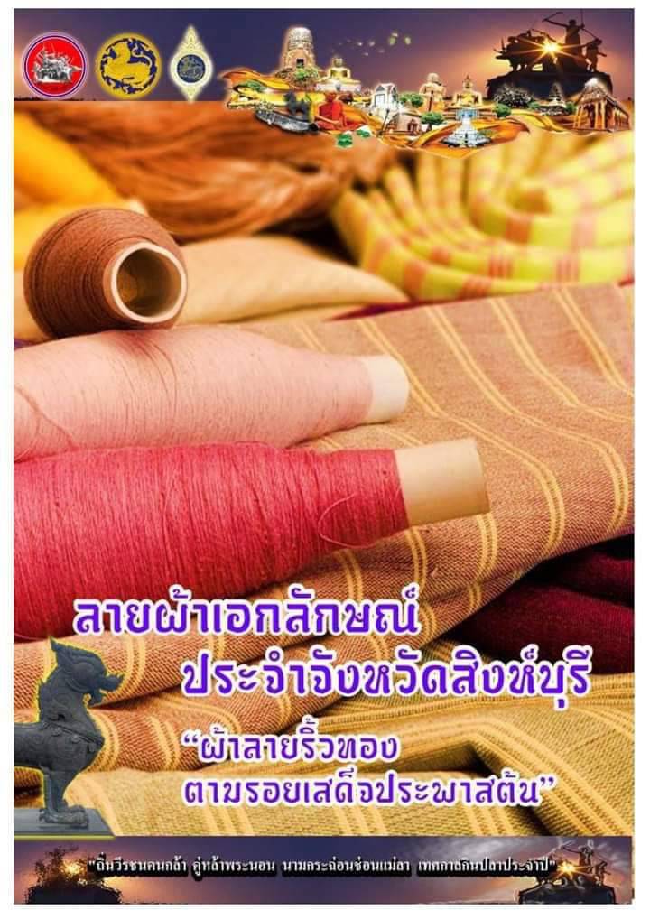 “ ผ้าลายริ้วทองตามรอยเสด็จประพาสต้น” มีความเป็นมาที่ชาวสิงห์บุรีมีความภาคภูมิใจที่จะส่งเสริมและต่อยอดลายผ้าริ้วทองให้ได้รับความนิยมอีกครั้ง โดยผ้าจะเป็นสีจากเปลือกมะกล่ำต้น ซึ่งเป็นต้นไม้ประจำจังหวัดสิงห์บุรี และมีสีแดงคล้ายหมากสุก ซึ่งเป็นสีเอกลักษณ์ของจังหวัดสิงห์บุรี สีแห่งนักรบ นักสู้โดยใช้สีทองที่เกิดจากการย้อมธรรมชาติด้วยเส้นไหมด้ายพุ่งสลับฝ้าย