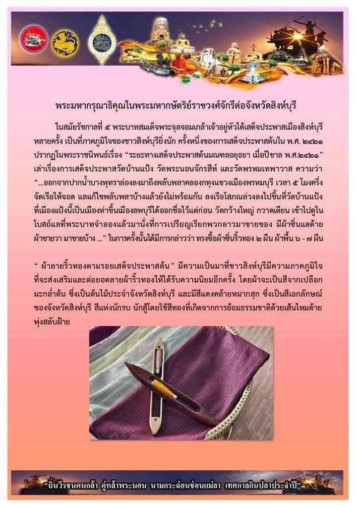 ในการนี้ นายชัยชาญ สิทธิวิรัชธรรม ผู้ว่าราชการจังหวัดสิงห์บุรี พร้อมด้วย นางจิตติวรรณ สิทธิวิรัชธรรม นายกเหล่ากาชาดจังหวัดสิงห์บุรี/ประธานแม่บ้านมหาดไทยจังหวัดสิงห์บุรี ทูลเกล้าทูลกระหม่อมถวายหนังสือข้อมูลผ้าประจำจังหวัดสิงห์บุรีและผ้าลายประจำจังหวัดสิงห์บุรี “ผ้าลายริ้วทองตามรอยเสด็จประพาสต้น” มีประวัติโดยย่อดังนี้ ย้อนไปในสมัยรัชกาลที่ 5 พระบาทสมเด็จพระจุลจอมเกล้าเจ้าอยู่หัวได้เสด็จประพาสเมืองสิงห์บุรีหลายครั้ง เป็นที่ภาคภูมิใจของชาวสิงห์บุรียิ่งนัก ครั้งหนึ่งของการเสด็จประพาสต้นใน พ.ศ. 2421 ปรากฏในพระราชนิพนธ์เรื่อง “ระยะทางเสด็จประพาสต้นมณฑลอยุธยา เมื่อปีขาล พ.ศ.2421” เล่าเรื่องการเสด็จประพาสวัดบ้านแป้ง วัดพระนอนจักรสีห์และวัดพรหมเทพาวาส ความว่า “…ออกจากปากน้ำบางพุทราล่องลงมาถึงพลับพลาคลองกทุงแขวงเมืองพรหมบุรี เวลา 5 โมงครึ่ง จัดเรือให้จอด แลแก้ไขพลับพลาบ้างแล้วยังไม่พร้อมกัน ลงเรือโสภณล่วงลงไปขึ้นที่วัดบ้านแป้ง ที่เมืองแป้งนี้เป็นเมืองท่าขึ้นเมืองลพบุรีได้ออกชื่อไว้แต่ก่อน วัดกว้างใหญ่ กวาดเตียน เข้าไปดูในโบสถ์แลที่พระบาทจำลองแล้วมานั่งที่การเปรียญเรียกพวกลาวมาขายของ มีผ้าซิ่นแลด้ายผ้าขายวา มาขายบ้าง …” ในการครั้งนั้นได้มีการกล่าวว่า ทรงซื้อผ้าซิ่นริ้วทอง 2 ผืน ผ้าพื้น 6 – 7 ผืน