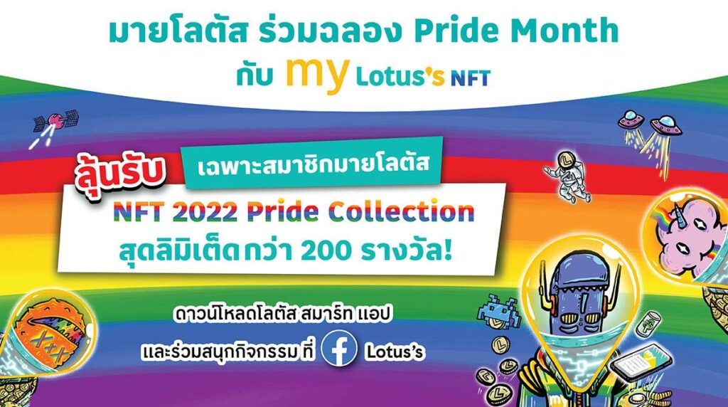 นอกจากนี้ มายโลตัส ยังมีกิจกรรม NFT เพื่อร่วมเฉลิมฉลอง Pride Month ในเดือนมิถุนายนนี้ด้วยเช่นกัน เพราะโลตัสเคารพและเชื่อว่าความแตกต่างทำให้โลกของเราสวยงามกว่าเดิม โลตัสจึงต่อยอดความร่วมมือกับคุณไตเติ้ล สร้างสรรค์ชิ้นงาน my Lotus’s NFT สุดลิมิเต็ดในคอลเลกชั่นพิเศษ “2022 Pride Collection” พร้อมแจกให้กับสมาชิกมายโลตัสกว่า 200 รางวัล โดยสามารถติดตามรายละเอียดกิจกรรมเพื่อร่วมสนุกและรับของรางวัลจาก my Lotus’s NFT 2022 Pride Collection ได้ทางเฟซบุ๊ก www.facebook.com/lotussth ตลอดเดือนมิถุนายนนี้