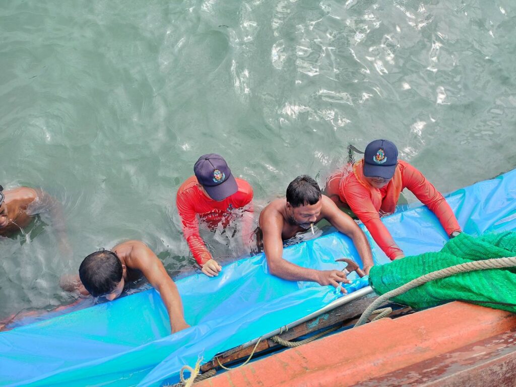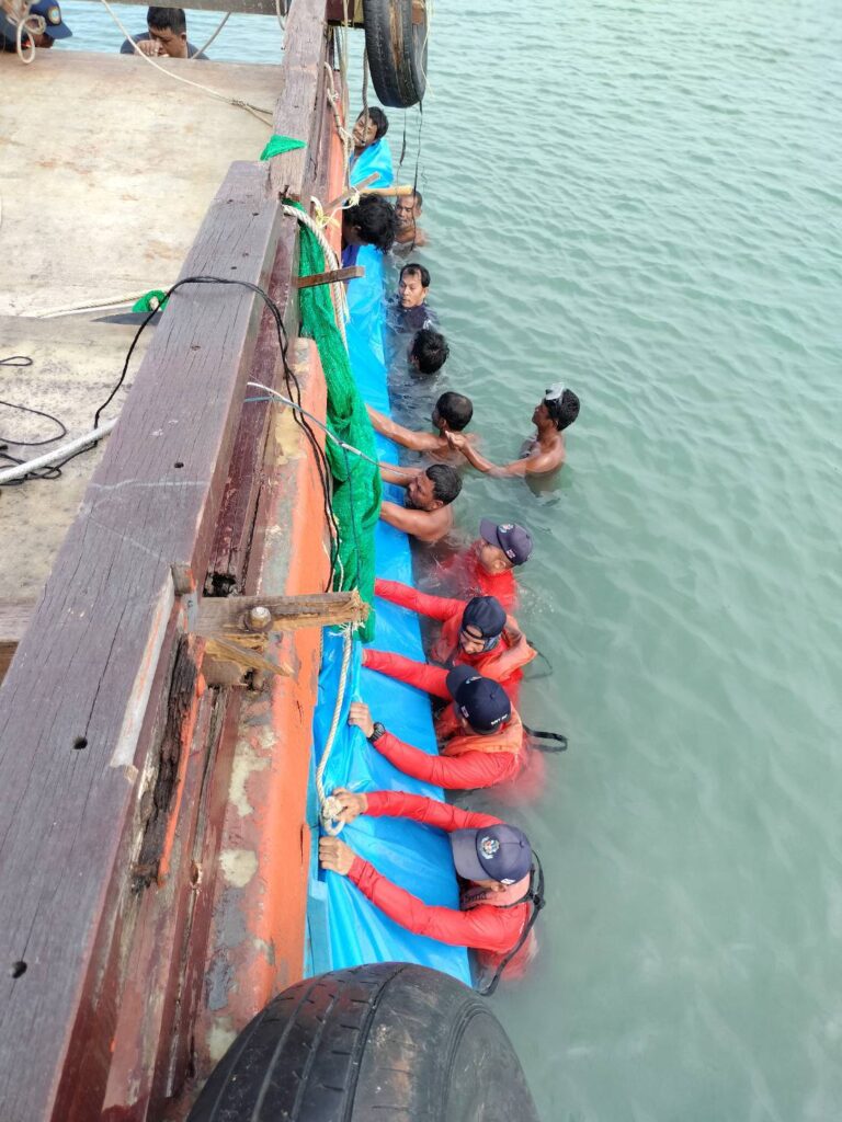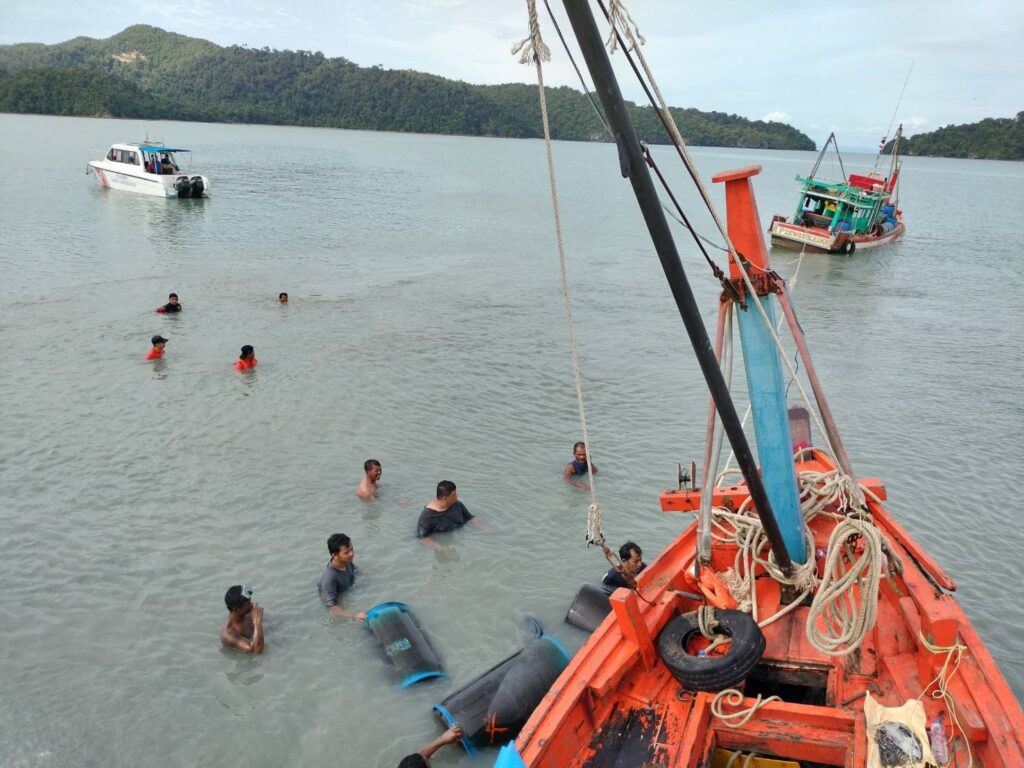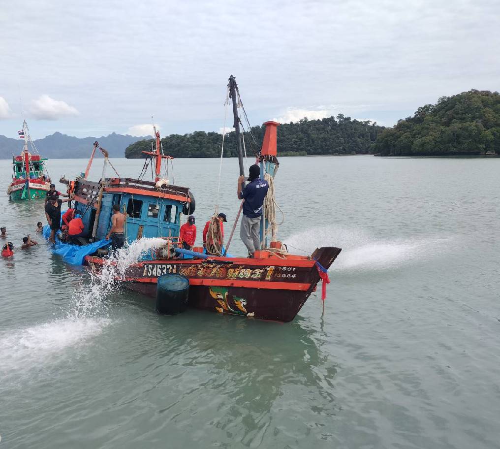 โดยได้ทำการลากเรือที่จมอยู่ใต้น้ำเข้ามายังบริเวณริมชายฝั่งเกาะตะรุเตา แล้วใช้ผ้ายางล้อมรอบกราบเรือส่วนที่อยู่ใต้น้ำ กันน้ำเข้าตัวเรือ พร้อมกับใช้เครื่องสูบน้ำทั้ง 3 เครื่อง สูบน้ำออกจากตัวเรือ โดยใช้เวลากว่า 6 ชม. จึงสามารถกู้เรือให้ลอยขึ้นสู่ผิวน้ำได้ และได้ทำการลากกลับเข้าฝั่ง ที่แพไทจินฮวด ต.เจ๊ะบิลัง อ.เมือง จังหวัดสตูล เพื่อซ่อมทำต่อไป