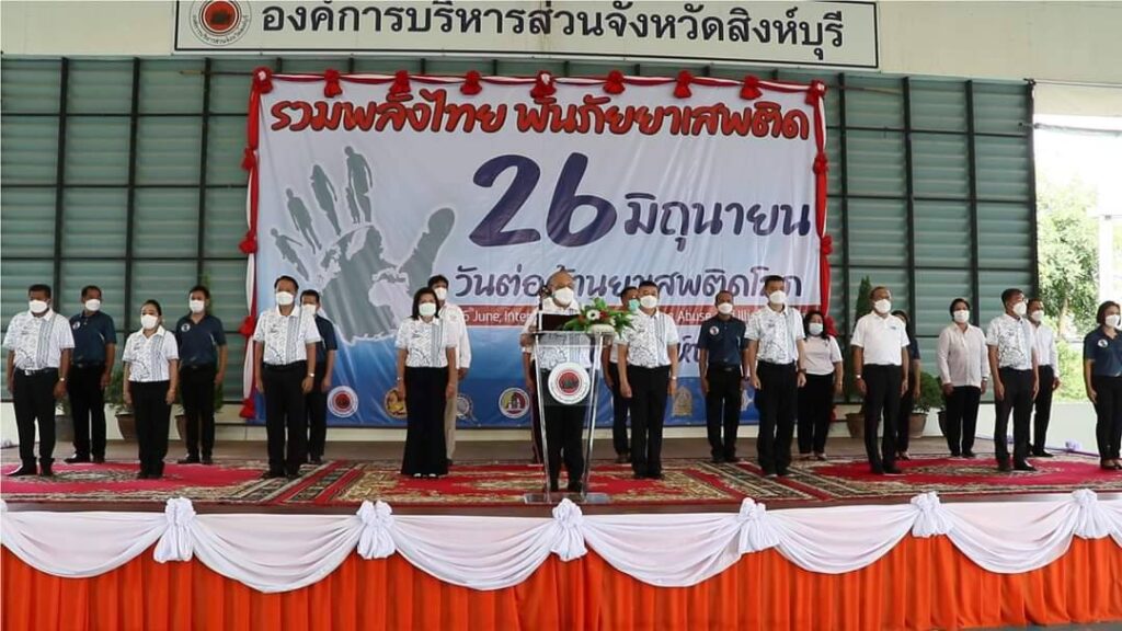 ทั้งนี้ศูนย์อำนวยการป้องกันและปราบปรามยาเสพติดจังหวัดสิงห์บุรี ได้ร่วมกับหน่วยงานที่เกี่ยวข้องในพื้นที่จัดกิจกรรมในวันนี้ขึ้นภายใต้กรอบแนวคิดและคำขวัญคือ “รวมพลังไทย พ้นภัยยาเสพติด” 26 มิถุนายน วันต่อต้านยาเสพติดโลก ตามมติการประชุมสมัชชาใหญ่องค์การสหประชาชาติเมื่อเดือนมิถุนายน 2530 ได้กำหนดให้วันที่ 26 มิถุนายนของทุกปีเป็นวันต่อต้านยาเสพติดโลก ในปัจจุบันรัฐบาลได้ให้ความสำคัญและยกระดับปัญหายาเสพติดขึ้นเป็นวาระแห่งชาติ และได้มีแนวทางการดำเนินงานเกี่ยวกับยาเสพติดโดยให้บูรณาการในทุกภาคส่วนในการแก้ไขปัญหายาเสพติดอย่างครบวงจร มุ่งเน้นดำเนินการ 3 มาตรการหลัก คือ 1. มาตรการด้านการป้องกัน2. มาตรการด้านการปราบปราม และ 3. มาตรการด้านการบำบัดรักษายาเสพติด รวมถึงรณรงค์ประชาสัมพันธ์เพื่อสร้างการรับรู้ให้กับประชาชนให้มีความรู้ความเข้าใจและตระหนักถึงการให้ความสำคัญในการแก้ไขปัญหายาเสพติด เพื่อให้ประชาชนเข้ามามีส่วนร่วมในการป้องกันและแก้ไขปัญหายาเสพติดในหมู่บ้านชุมชนของตนให้ปลอดภัยจากยาเสพติดอย่างยั่งยืน
