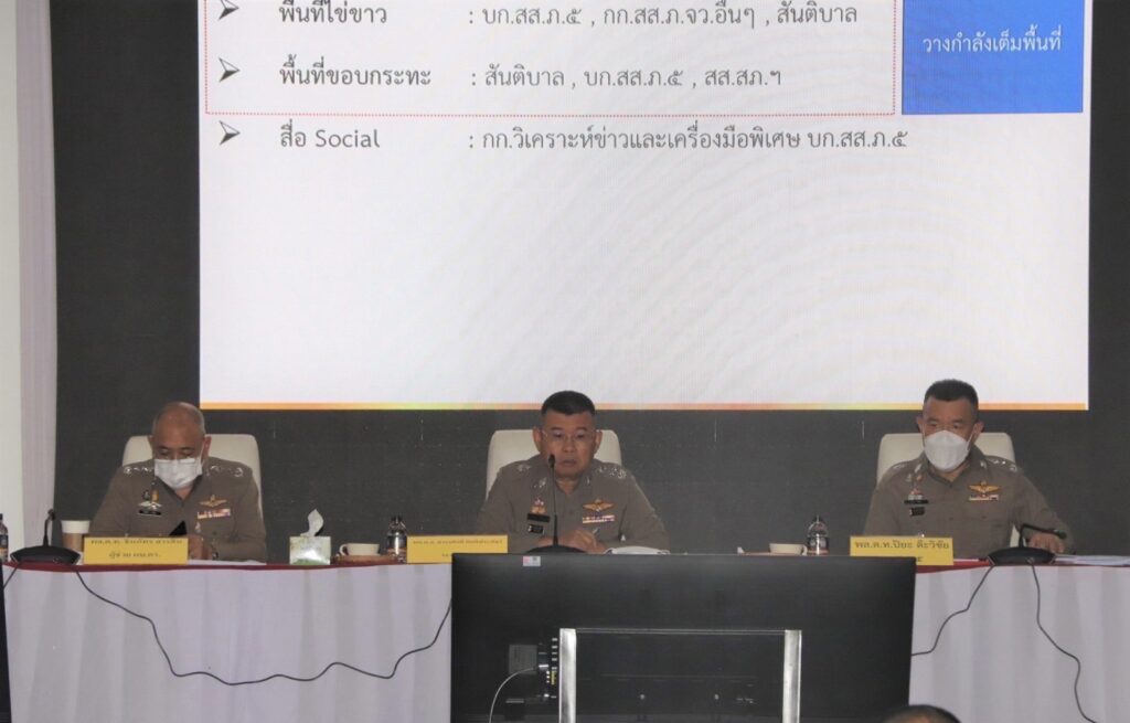 พล.ต.อ.ดำรงค์ศักดิ์ กิตติประภัสร์ รอง ผบ.ตร. เป็นประธานการประชุมรายงานผลการปฏิบัติราชการงานความมั่นคงและงานกิจการพิเศษ โดยมี พล.ต.ท.ชินภัทร สารสิน ผช.ผบ.ตร.(กศ 2), พล.ต.ท.ปิยะ ต๊ะวิชัย ผบช.ภ.5, พล.ต.ต.พิเชษฐ์ จีระนันตสิน รอง ผบช.ภ.5, พล.ต.ต.วีรชน บุญทวี รอง ผบช.ภ.5, พล.ต.ต.สมกูล กาญจนอุดมการ ผบก.ตชด.ภาค3, พล.ต.ต.วริษร์สิริภ์ ลีละสิริ ผบก.ทท.2, พล.ต.ต.วรพงศ์ คำลือ ผบก.สส.ภ.5, พล.ต.ต.ธวัชชัย พงษ์วิวัฒนชัย ผบก.ภ.จว.เชียงใหม่ และเจ้าหน้าที่ที่เกี่ยวข้องเข้าร่วมประชุม ณ ห้องประชุมอาคารคุ้มแก้วขวัญดาว ตำรวจภูธรภาค5 อ.เมือง จว.เชียงใหม่