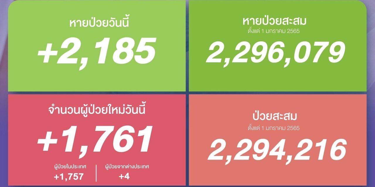 หายป่วยสะสม 2,296,079 ราย (ตั้งแต่ 1 มกราคม 2565)