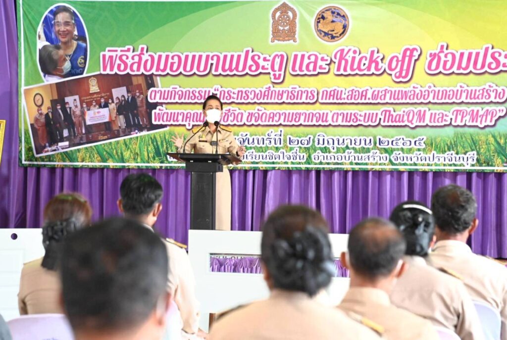 เมื่อวันที่ 27 มิถุนายน 2565 นางกนกวรรณ วิลาวัลย์ รัฐมนตรีช่วยว่าการกระทรวงศึกษาธิการ เป็นประธานพิธีส่งมอบบานประตูพีวีซี ลูกบิดและบานพับ พร้อม Kick-off ซ่อมประตู ตามกิจกรรม “กระทรวงศึกษาธิการ (กศน.)-(สอศ.) ผสานพลังอำเภอบ้านสร้าง พัฒนาคุณภาพชีวิต ขจัดความยากจน ตามระบบ ThaiQM และ TPMAP” ณ หอประชุม โรงเรียนซิตใจชื่น ตำบลบ้านสร้าง อำเภอบ้านสร้าง จังหวัดปราจีนบุรี