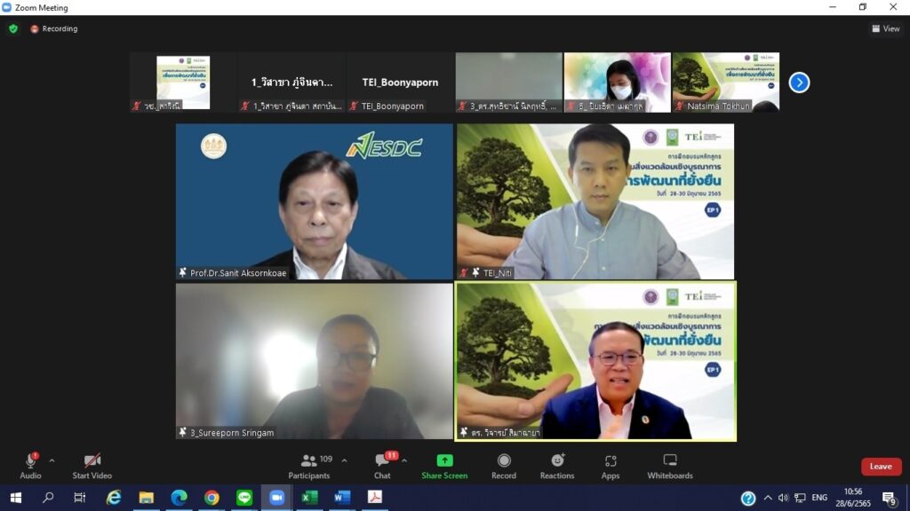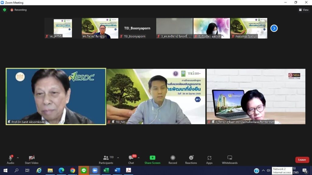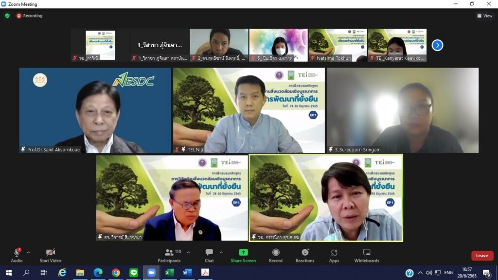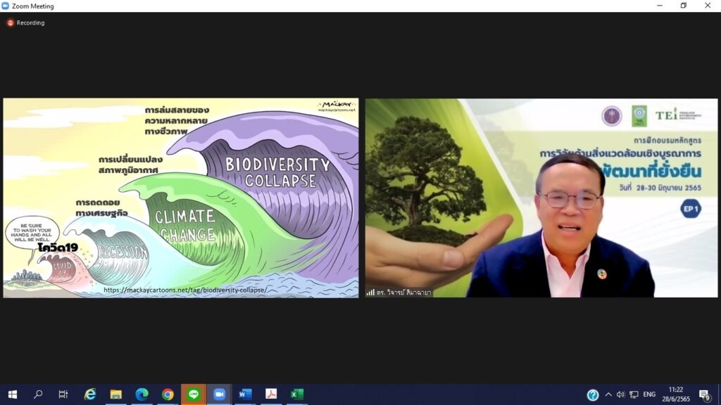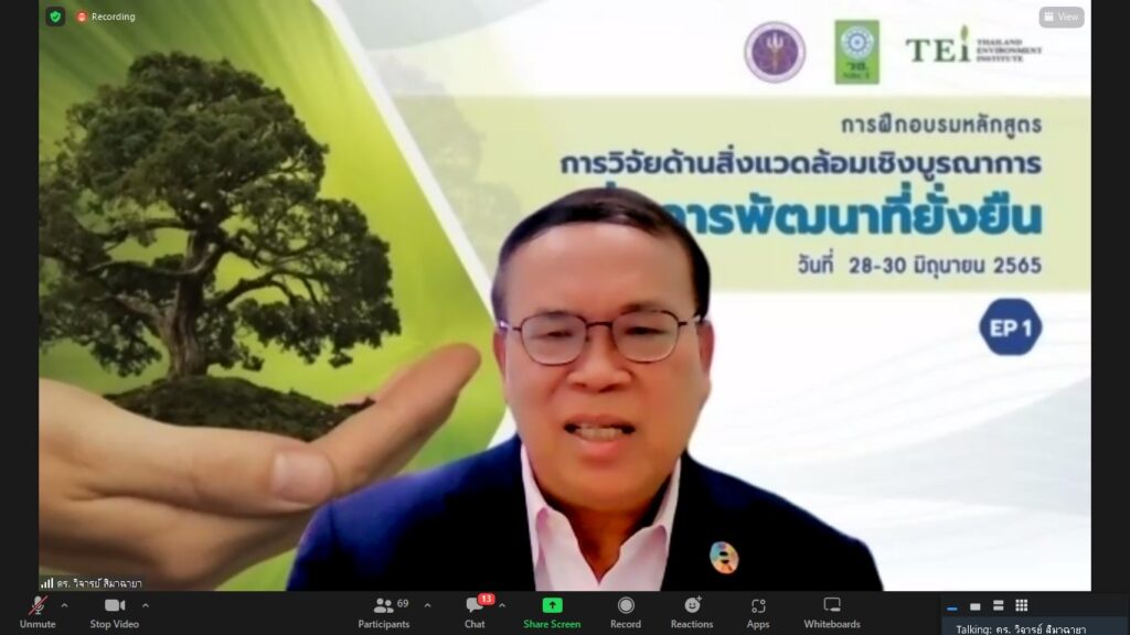 วันที่ 28 มิถุนายน 2565 สำนักงานการวิจัยแห่งชาติ (วช.) กระทรวงการอุดมศึกษา วิทยาศาสตร์ วิจัยและนวัตกรรม (อว.) ร่วมกับ สถาบันสิ่งแวดล้อมไทย (TEI) เปิดโครงการ “การพัฒนาองค์ความรู้และเครือข่ายบุคลากรวิจัยด้านสิ่งแวดล้อมเพื่อการพัฒนาที่ยั่งยืน” และเปิดอบรมหลักสูตร “การวิจัยเชิงบูรณาการเพื่อการพัฒนาที่ยั่งยืน” ซึ่งเป็นหลักสูตรแรกจากทั้งหมด 6 หลักสูตร เป็นหลักสูตรระยะสั้นเพื่อส่งเสริมความรู้ ความเข้าใจนักวิจัยและนักวิชาการด้านสิ่งแวดล้อม เกี่ยวกับกรอบ นโยบาย แผนและทิศทางการวิจัยและการพัฒนาสิ่งแวดล้อมของประเทศ กระแสสิ่งแวดล้อมโลกสู่ความยั่งยืน รวมทั้งการพัฒนาเครือข่ายนักวิจัยเชิงบูรณาลักษณะสหวิชาการในเชิงประเด็น หรือ พื้นที่