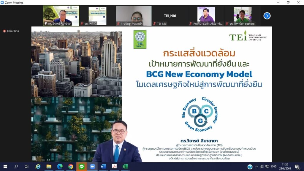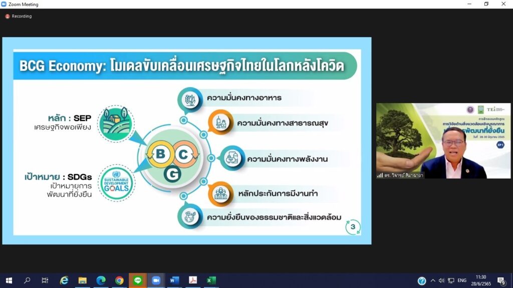 ดร.วิจารย์ สิมาฉายา ผู้อำนวยการสถาบันสิ่งแวดล้อมไทย ผู้ทรงคุณวุฒิในคณะกรรมการ BCG และประธานอนุกรรมการขับเคลื่อนเศรษฐกิจ BCG สาขาเศรษฐกิจหมุนเวียน กล่าวว่า เป้าหมายการพัฒนาที่ยั่งยืน และ BCG New Economy Model โมเดลเศรษฐกิจใหม่สู่การพัฒนาที่ยั่งยืน ซึ่งจะช่วยต่อยอดจุดแข็งของประเทศ ให้มีมูลค่าเพิ่มขึ้น ทั้งในด้านความหลากหลายทางชีวภาพและความหลากหลายทางวัฒนธรรม