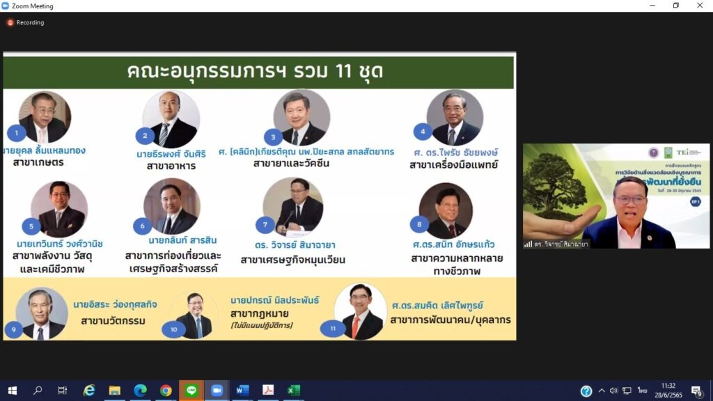 โดยมี ดร.วิภารัตน์ ดีอ่อง ผู้อำนวยการสำนักงานการวิจัยแห่งชาติ (วช.) เป็นประธานเปิดงานฯ พร้อมด้วย ศ.ดร.สนิท อักษรแก้ว ประธานสภาพัฒนาการเศรษฐกิจและสังคมแห่งชาติ และ ดร.วิจารย์ สิมาฉายา ผู้อำนวยการสถาบันสิ่งแวดล้อมไทย ผู้ทรงคุณวุฒิในคณะกรรมการ BCG และประธานอนุกรรมการขับเคลื่อนเศรษฐกิจ BCG สาขาเศรษฐกิจหมุนเวียน เพื่อสนับสนุนให้งานวิจัยไทยได้รับการยอมรับและถูกนำไปใช้ในการแก้ไขปัญหาสิ่งแวดล้อมของประเทศ