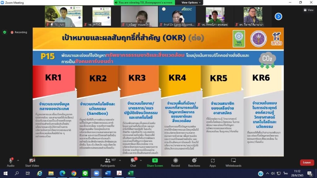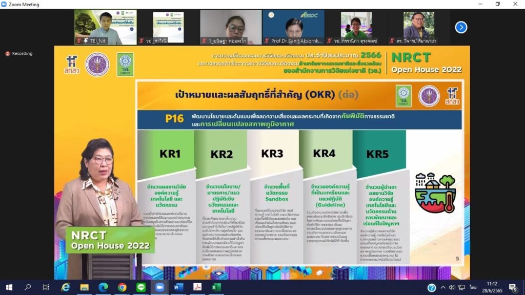 ในการพัฒนางานวิจัยและนวัตกรรมด้านทรัพยากรธรรมชาติและสิ่งแวดล้อมให้สามารถตอบโจทย์ของหน่วยงานผู้ใช้ประโยชน์ผลงานวิจัย วิทยาศาสตร์ วิจัย เทคโนโลยี และนวัตกรรม สนับสนุนแก้ไขปัญหาทรัพยากรธรรมชาติและสิ่งแวดล้อมของประเทศอย่างมีประสิทธิภาพมุ่งสู่การพัฒนาประเทศอย่างยั่งยืน ซึ่งกิจกรรมดังกล่าวจัดขึ้น ระหว่างวันที่ 28-30 มิถุนายน 2565 ผ่านระบบออนไลน์ zoom meeting