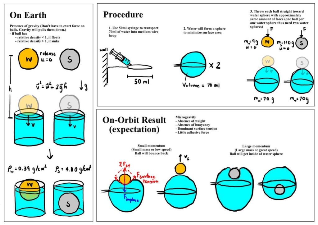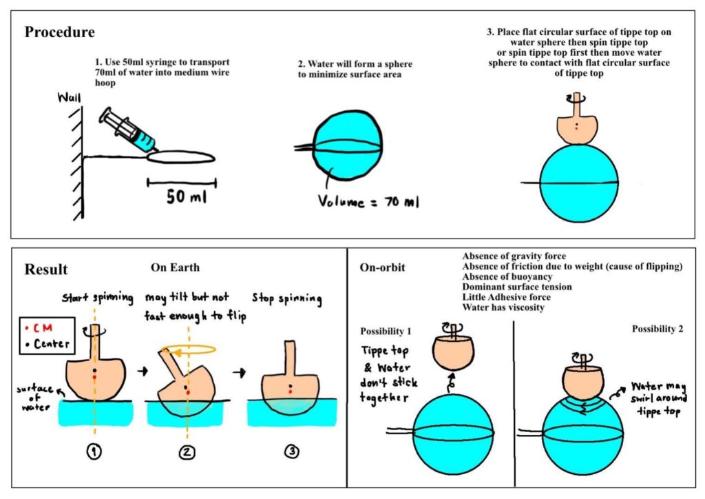นางกุลประภา กล่าวว่า “สำหรับแนวคิดการทดลองทั้ง 2 เรื่อง ที่ได้รับการคัดเลือกประกอบด้วย ไอเดียการทดลองของ นางสาวจิณณะ วัยวัฒนะ (พรีม) นักเรียนชั้น ม.6 โรงเรียนมหิดลวิทยานุสรณ์ เรื่องการศึกษาพฤติกรรมของก้อนน้ำทรงกลมเมื่อถูกแรงกระทำในสภาวะแรงโน้มถ่วงต่ำ (Water sphere disturbance in zero gravity) มีไอเดียการทดลองว่าจะเกิดอะไรขึ้นถ้าน้ำถูกแรงจากภายนอกกระทำ ซึ่งการทดลองแบ่งเป็น 2 ส่วน ส่วนแรกเป็นการศึกษาพฤติกรรมของน้ำเมื่อได้รับแรงดลจากการชนของลูกบอลที่มีมวลแตกต่างกัน คือบอลไม้และบอลเหล็ก โดยการออกแรงผลักลูกบอลให้เคลื่อนที่มาชนกัน และส่วนที่ 2 เป็นการศึกษาการหมุนของลูกข่างกระดกบนผิวน้ำ ซึ่งลูกข่างกระดกเป็นลูกข่างที่ออกแบบให้จุดศูนย์กลางทางเรขาคณิตอยู่คนละจุดกับจุดศูนย์กลางมวลทำให้เมื่อหมุนไปสักระยะลูกข่างจะสามารถพลิกกลับด้านได้ จึงอยากรู้ว่าในสภาวะไร้แรงโน้มถ่วงผลจะเป็นอย่างไร”