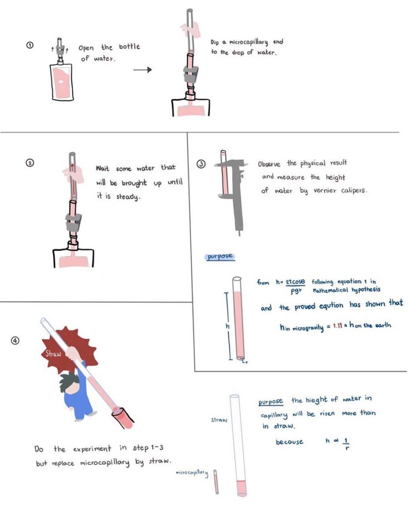 “ไอเดียการทดลองที่ 2 ของนางสาวอินทิราภรณ์ เชาว์ดี (ปาย) บัณฑิตจากคณะเภสัชศาสตร์ มหาวิทยาลัยธรรมศาสตร์ เรื่องการศึกษาระดับน้ำที่สูงขึ้นจากแรงดึงของผิวภาชนะในสภาวะแรงโน้มถ่วงต่ำ (Study of the height of water which is risen up in microgravity) เป็นการทดลองที่เกิดจากความสนใจเกี่ยวกับการขนส่งของเหลวผ่านท่อในสภาวะไร้แรงโน้มถ่วง โดยตั้งสมมติฐานว่าเมื่ออยู่ในสภาวะที่มีแรงโน้มถ่วงต่ำ เช่น ในระดับความสูงของสถานีอวกาศนานาชาติ จะส่งผลให้ของเหลวที่อยู่ในท่อสามารถขึ้นไปในระดับที่สูงกว่าเมื่อเทียบกับระดับความสูงของของเหลวที่ทำการทดลองบนพื้นโลกอยู่ 1.11 เท่า นอกจากนี้ยังมีการทดลองเปรียบเทียบขนาดรัศมีของท่อที่แตกต่างกันด้วยว่าจะส่งผลให้ระดับความสูงของของเหลวขึ้นไปตามท่อได้แตกต่างกันหรือไม่”