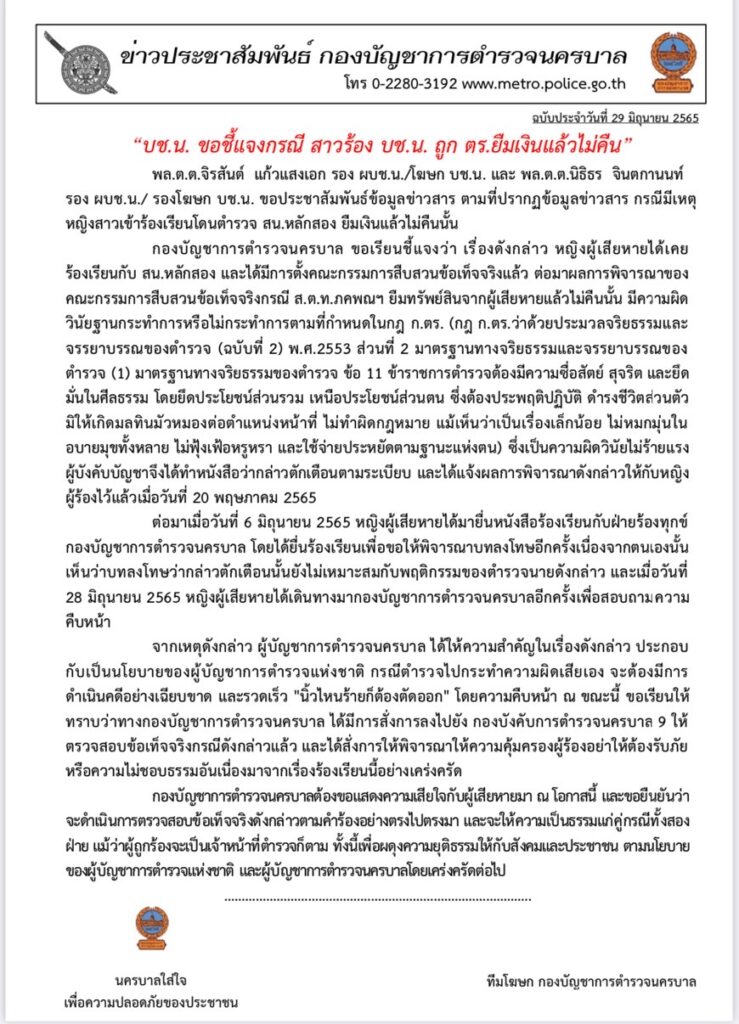 กองบัญชาการตำรวจนครบาล ขอเรียนชี้แจงว่า เรื่องดังกล่าว หญิงผู้เสียหายได้เคยร้องเรียนกับ สน.หลักสอง และได้มีการตั้งคณะกรรมการสืบสวนข้อเท็จจริงแล้ว ต่อมาผลการพิจารณาของคณะกรรมการสืบสวนข้อเท็จจริงกรณี ส.ต.ท.ภคพณฯ ยืมทรัพย์สินจากผู้เสียหายแล้วไม่คืนนั้น มีความผิดวินัยฐานกระทำการหรือไม่กระทำการตามที่กำหนดในกฎ ก.ตร. (กฎ ก.ตร.ว่าด้วยประมวลจริยธรรม และจรรยาบรรณของตำรวจ (ฉบับที่ 2) พ.ศ.2553 ส่วนที่ 2 มาตรฐานทางจริยธรรมและจรรยาบรรณของตำรวจ (1) มาตรฐานทางจริยธรรมของตำรวจ ข้อ 11 ข้าราชการตำรวจต้องมีความซื่อสัตย์ สุจริต และยึดมั่นในศีลธรรม โดยยึดประโยชน์ส่วนรวม เหนือประโยชน์ส่วนตน ซึ่งต้องประพฤติปฏิบัติ ดำรงชีวิตส่วนตัวมิให้เกิดมลทินมัวหมองต่อตำแหน่งหน้าที่ ไม่ทำผิดกฎหมาย แม้เห็นว่าเป็นเรื่องเล็กน้อย ไม่หมกมุ่นในอบายมุขทั้งหลาย ไม่ฟุ้งเฟ้อหรูหรา และใช้จ่ายประหยัดตามฐานะแห่งตน) ซึ่งเป็นความผิดวินัยไม่ร้ายแรง ผู้บังคับบัญชาจึงได้ทำหนังสือว่ากล่าวตักเตือนตามระเบียบ และได้แจ้งผลการพิจารณาดังกล่าวให้กับหญิงผู้ร้องไว้แล้วเมื่อวันที่ 20 พฤษภาคม 2565