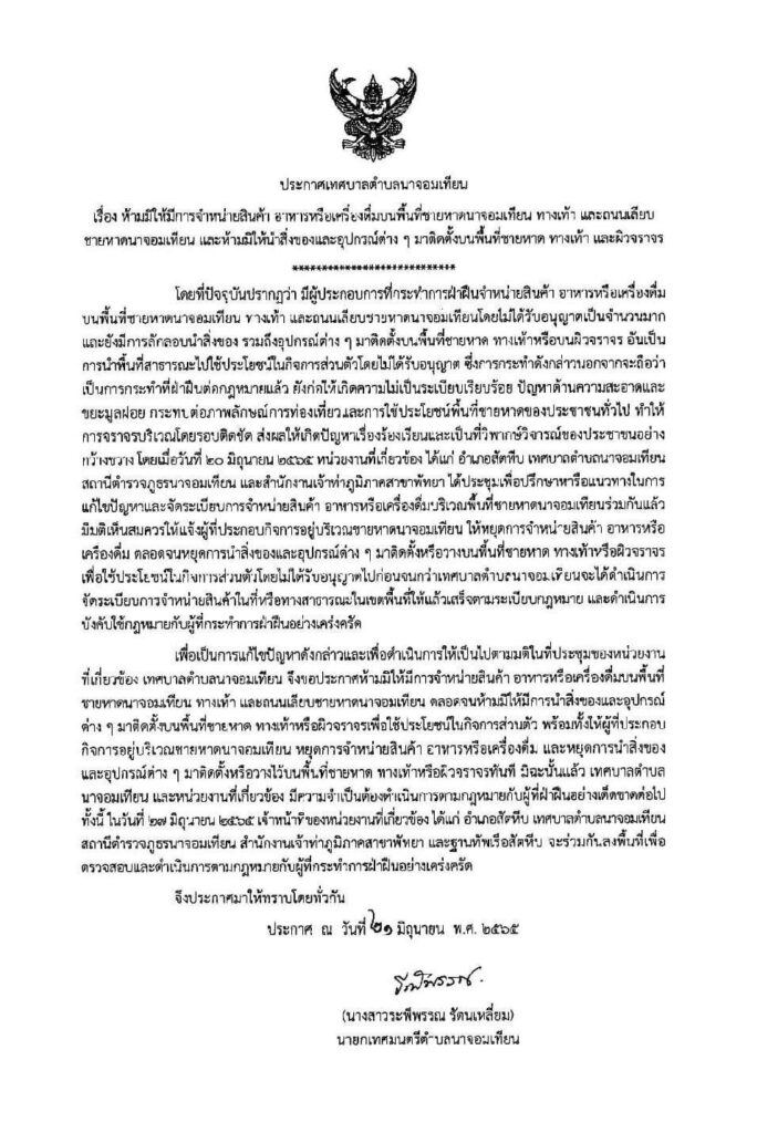 กรมเจ้าท่า กระทรวงคมนาคม ต้องขอขอบคุณเทศบาลตำบลนาจอมเทียน หน่วยงานทุกภาคส่วน ที่เข้ามาดำเนินการบริหารจัดการคืนพื้นที่สาธารณะและจัดระเบียบพื้นที่ให้กับประชาชนได้ใช้ประโยชน์ร่วมกัน พร้อมขอความร่วมมือประชาชนผู้มาใช้ชายหาดจอมเทียนทุกท่าน โปรดช่วยกันรักษาความสะอาด ปฏิบัติตามคำแนะนำของเทศบาลตำบลนาจอมเทียนและหน่วยงานที่เกี่ยวข้อง ช่วยป้องกัน ดูแล รักษาชายหาดและระบบนิเวศชายฝั่งให้ยังคงสภาพเดิม ลดการเกิดความเสื่อมโทรมในพื้นที่ และส่งเสริมภาคการท่องเที่ยวอุตสาหกรรมอย่างยั่งยืน