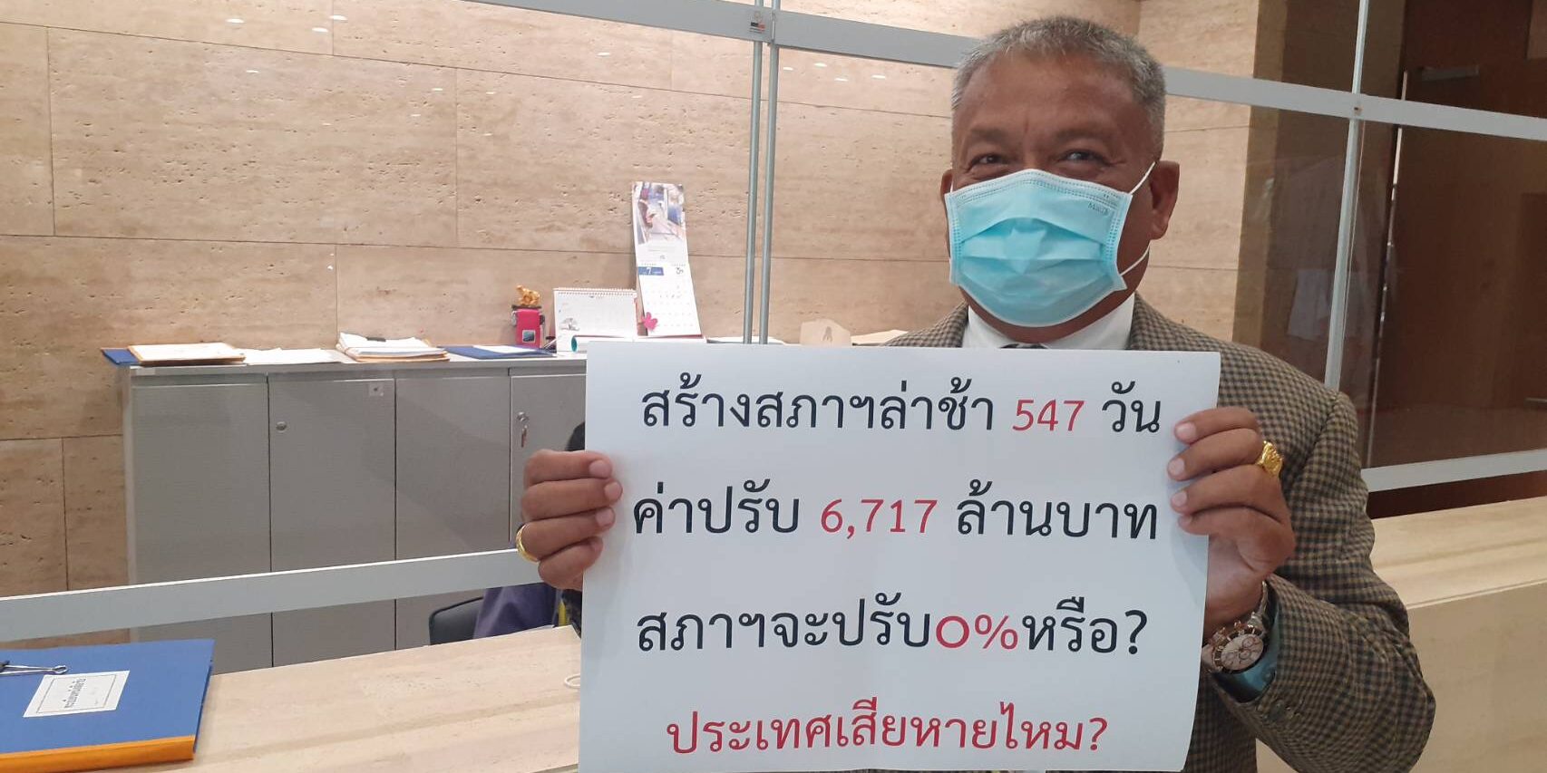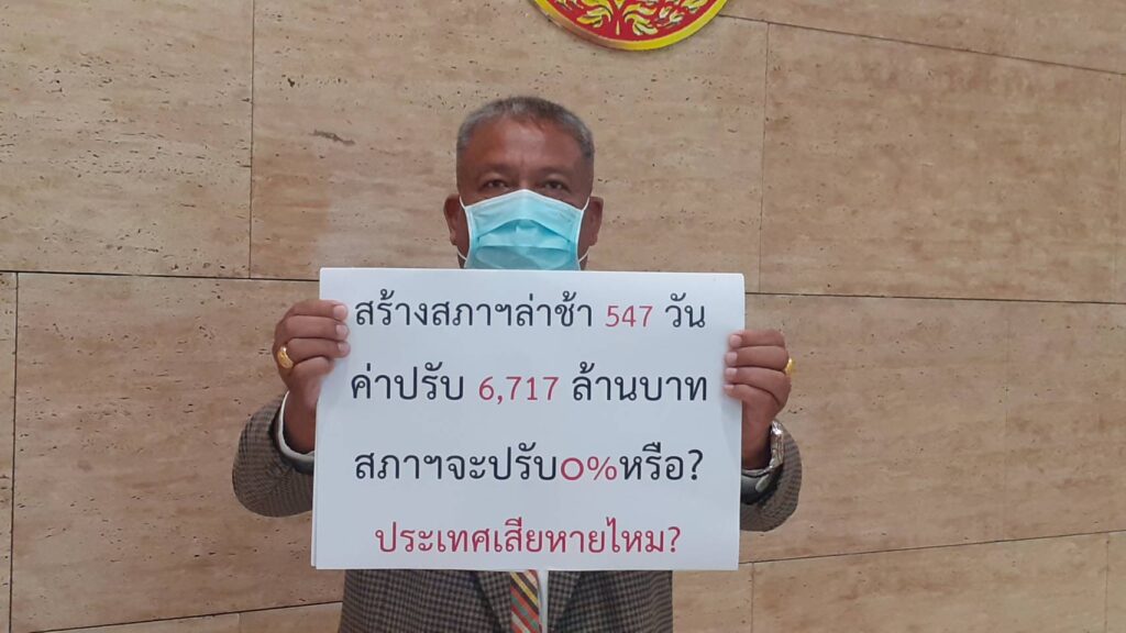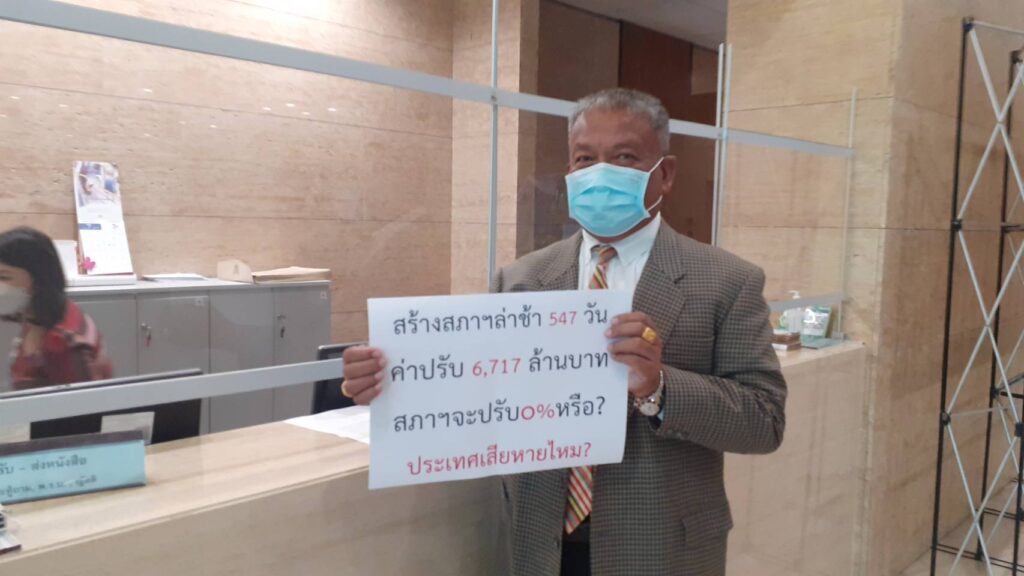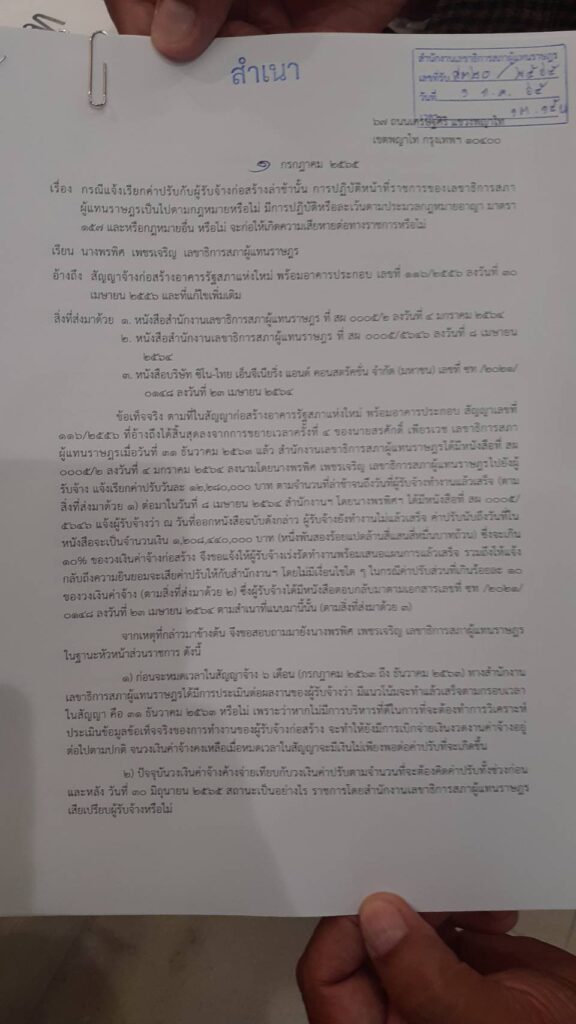 โดยข้อเท็จจริง ตามสัญญาก่อสร้างอาคารรัฐสภาแห่งใหม่ พร้อมอาคารประกอบ สัญญาเลขที่ 116/2556 ที่อ้างถึงได้สิ้นสุดลงจากการขยายเวลาครั้งที่ 4 ของนายสรศักดิ์ เพียรเวช เลขาธิการสภาผู้แทนราษฎรเมื่อวันที่ 31 ธ.ค.63 แล้ว สำนักงานเลขาธิการสภาผู้แทนราษฎรได้มีหนังสือที่ สผ 0005/2 ลงวันที่ 4 ม.ค.64 ลงนามโดยนางพรพิศ เพชรเจริญ เลขาธิการสภาผู้แทนราษฎรไปยังผู้รับจ้าง แจ้งเรียกค่าปรับวันละ 12,280,000 บาท ตามจำนวนที่ล่าช้าจนถึงวันที่ผู้รับจ้างทำงานแล้วเสร็จ ต่อมาในวันที่ 8 เม.ย.64 สำนักงานฯ โดยนางพรพิศ ได้มีหนังสือที่ สผ 0005/5646 แจ้งผู้รับจ้างว่า ณ วันที่ออกหนังสือฉบับดังกล่าว ผู้รับจ้างยังทำงานไม่แล้วเสร็จ ค่าปรับนับถึงวันที่ในหนังสือจะเป็นจำนวนเงิน 1,208,440,000 บาท (หนึ่งพันสองร้อยแปดล้านสี่แสนสี่หมื่นบาทถ้วน) ซึ่งจะเกิน 10% ของวงเงินค่าจ้างก่อสร้าง จึงขอแจ้งให้ผู้รับจ้างเร่งรัดทำงานพร้อมเสนอแผนการแล้วเสร็จ รวมถึงให้แจ้งกลับถึงความยินยอมจะเสียค่าปรับให้กับสำนักงานฯ โดยไม่มีเงื่อนไขใด ๆ ในกรณีค่าปรับส่วนที่เกินร้อยละ 10 ของวงเงินค่าจ้าง ซึ่งผู้รับจ้างได้มีหนังสือตอบกลับมาตามเอกสารเลขที่ ซท /2021/0148 ลงวันที่ 23 เม.ย.64
