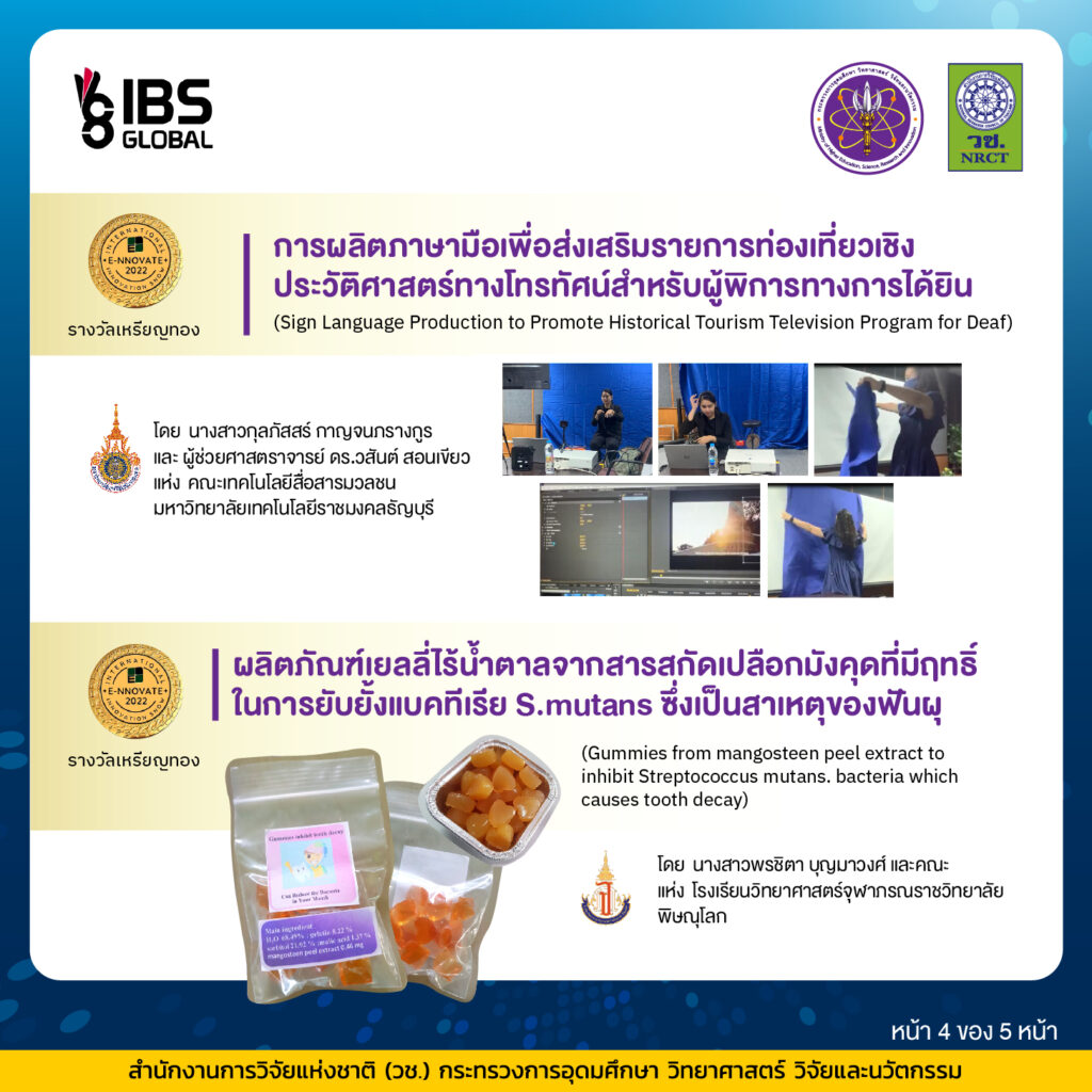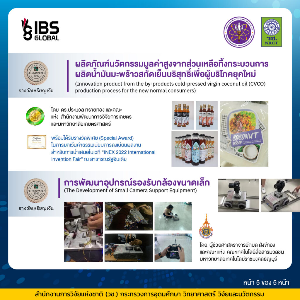 ในงาน “E-NNOVATE 2022 Edition : International Innovation Show” ซึ่งจัดขึ้นระหว่างวันที่ 8–10 มิถุนายน 2565 ณ สาธารณรัฐโปแลนด์ ในรูปแบบออนไซต์ และระหว่างวันที่ 15–16 มิถุนายน 2565 ในรูปแบบออนไลน์ ซึ่งในปีนี้จัดขึ้นเป็นปีที่ 3 โดย Innovative Business Solutions (IBS) หน่วยงานเอกชนด้านการส่งเสริมนวัตกรรมสู่เชิงพาณิชย์ แห่งสาธารณรัฐโปแลนด์ โดยมีนักวิจัย/นักประดิษฐ์จากประเทศต่างๆ นำผลงานเข้าร่วมประกวดและจัดแสดงในงานจำนวน 145 ผลงาน จาก 15 ประเทศ ซึ่งเป็นที่น่ายินดีที่นักประดิษฐ์ไทยสามารถคว้ารางวัลต่างๆ ประกอบด้วย รางวัลเหรียญทอง (Gold Medal) จำนวน 4 รางวัล รางวัลเหรียญเงิน (Silver Medal) จำนวน 2 รางวัล และรางวัลพิเศษ (Special Award) ซึ่งเป็นการได้รับสิทธิ์ในการยกเว้นค่าธรรมเนียมการลงเบียนผลงานสำหรับการนำเสนอผลงานในเวทีการประกวดสิ่งประดิษฐ์และนวัตกรรมระดับนานาชาติ จำนวน 2 รางวัล ดังนี้