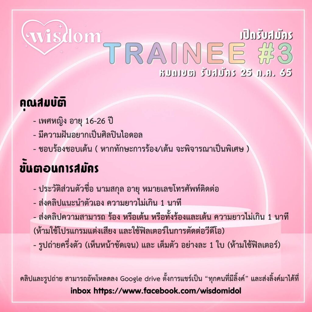 วงไอดอลมาแรง วงWISDOM เปิดรับTrainee รุ่น3 โดยผู้บริหาร คุณวิเนตร คำหนุน และ คุณอาธิติยา แก้วเงิน เปิดรับผู้ที่มีความฝันอยากเป็นศิลปินไอดอล รักการร้องเพลงการเต้นและการแสดงออก โดย นโยบายของวงมุ่นเน้นสนับสนุน และพัฒนาในทุกๆด้านให้กับน้องๆที่มีความตั้งใจอยากมาเป็นส่วนหนึ่งในครอบครัว WISDOM โดยเป้าหมายในอนาคต วงจะจัดยูนิตต่างๆเพื่อรองรับความสามารถที่หลากหลาย รวมถึง งานที่กำลังเข้ามาในหลายๆรูปแบบ โดยคุณสมบัติการสมัครมีดังนี้