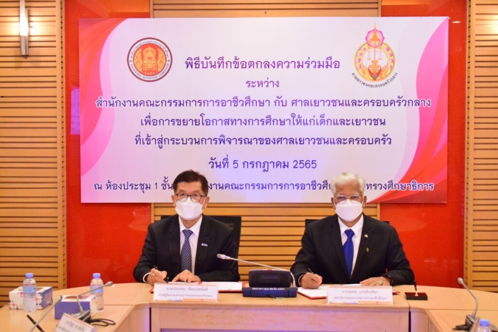 เมื่อวันที่ 5 กรกฎาคม 2565 : ศาลเยาวชนและครอบครัวกลาง โดยท่านประกอบ ลีนะเปสนันท์ และสำนักงานคณะกรรมการการอาชีวศึกษา โดยท่านสุเทพ แก่งสันเทียะ ลงนามในบันทึกข้อตกลงความร่วมมือเพื่อขยายโอกาสทางการศึกษาแก่เยาวชนที่เข้าสู่กระบวนการของศาลเยาวชนและครอบครัว ทั่วราชอาณาจักรได้เข้าศึกษาระดับ ปวช.ในวิทยาลัยสังกัด สอศ.