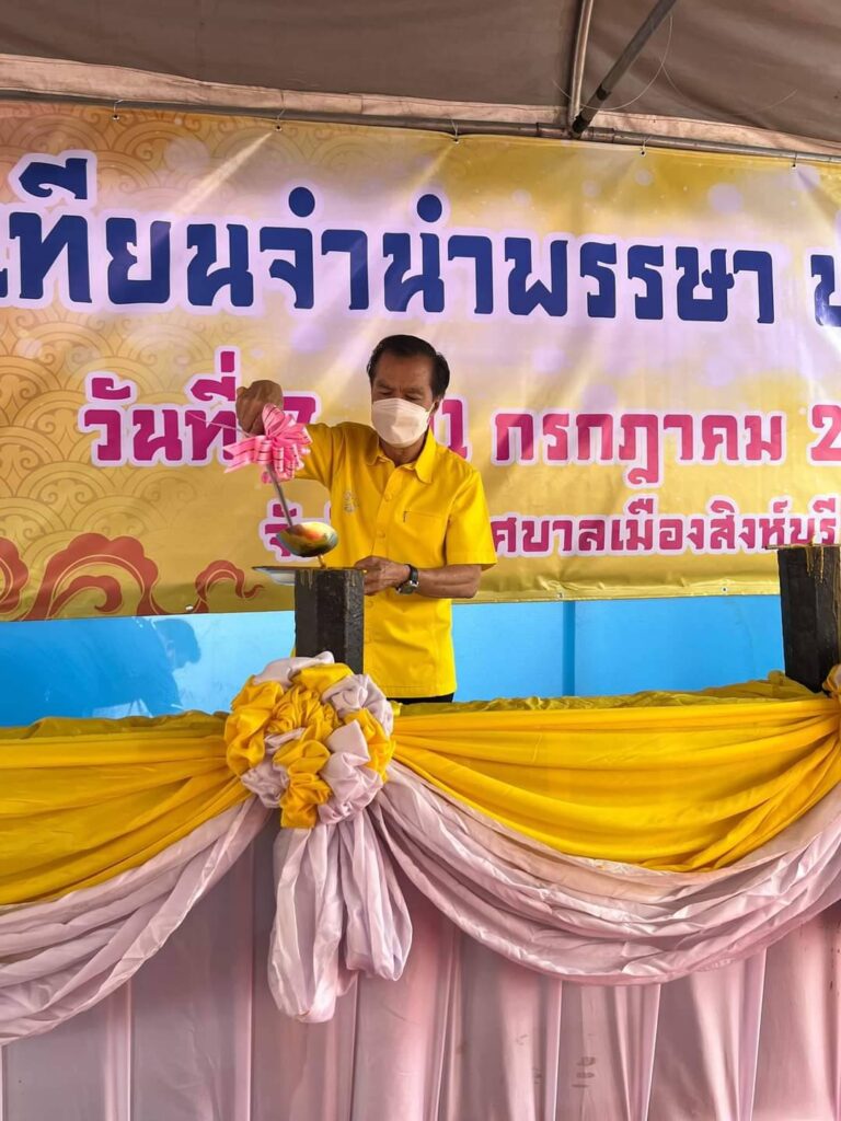 วันที่ 7 ก.ค. 65 เวลานายปัญญา ใช้เฮง นายอำเภอเมืองสิงห์บุรี เป็นประธานในพิธีหล่อเทียนจำนำพรรษาประจำปี 2565 เทศบาลเมืองสิงห์บุรีโดยมีนายณรงค์ศักดิ์ วิงวอน นายกเทศมนตรีเมืองสิงห์บุรีกล่าวรายงานวัตถุประสงค์ ของการจัดโครงการหล่อเทียนจำนำพรรษา ประจำปี 2565 โดยกำหนดงานจะมีขึ้นในวันที่ 7-12 กรกฎาคม 2565 ในพิธีเปิดหล่อเทียนจำนำพรรษา มีนายกู้เกียรติ นิ่มเนียม ท้องถิ่นจังหวัดสิงห์บุรี นายเสวก วิงวอน สมาชิกสภา อบจ.สิงห์บุรี คุณแม่ภรณี ธนาคมานุสรณ์ สตรีดีเด่นจังหวัดสิงห์บุรี คุณลำดวน ใจบาน เลขานุการ อบจ.สิงห์บุรี ผู้จัดการธนาคารออมสิน หัวหน้าส่วนราชการ ประธานชุมชน ผู้อำนวยการโรงเรียนและครูนักเรียนในสังกัดเทศบาล พร้อมด้วยหน่วยงานภาครัฐ และองค์กรเอกชน ประชาชน ในเขตเทศบาลมาร่วมในพิธีเปิด