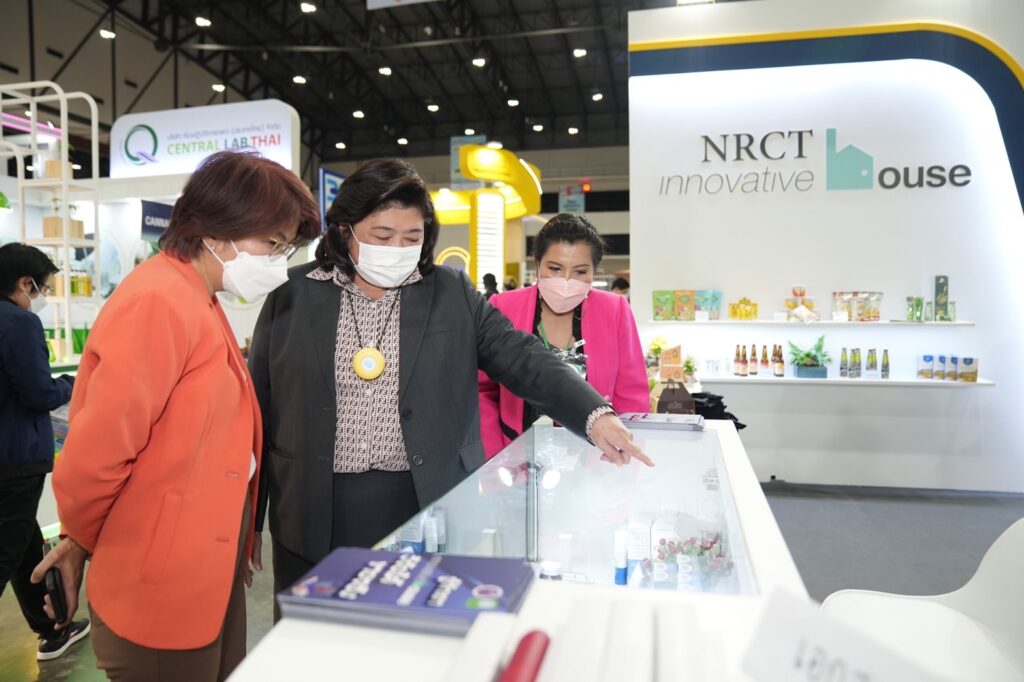 ดร.วิภารัตน์ ดีอ่อง ผู้อำนวยการสำนักงานการวิจัยแห่งชาติ (วช.) เปิดเผยว่า สำนักงานการวิจัยแห่งชาติ (วช.) กระทรวงการอุดมศึกษา วิทยาศาสตร์ วิจัยและนวัตกรรม ในฐานะที่เป็นหน่วยงานหลักทำหน้าที่ในการสนับสนุนทุนวิจัยและนวัตกรรมแก่หน่วยงานต่างๆ ซึ่ง (วช.) จะสนับสนุนทุนวิจัยและนวัตกรรมในประเด็นสำคัญ ด้านการวิจัยเชิงรุกโดยผลการวิจัยจะต้องมีเป้าหมายของผลผลิตและใช้ประโยชน์ได้จริง และเกิดเป็นผลลัพธ์ที่สามารถนำไปใช้ประโยชน์ทั้งในเชิงเศรษฐกิจ สังคม และการพัฒนาประเทศในด้านต่างๆ จากผลสำเร็จของการดำเนินงานในช่วงที่ผ่านมา (วช.) จึงได้นำผลงานการวิจัยที่ได้รับการสนับสนุนเข้าร่วมแสดงนิทรรศการในงาน Smart SME Expo 2022 รูปแบบการจัดงานจะเป็นบูธศูนย์บริการให้คำปรึกษาด้านการวิจัยและนวัตกรรม ภายใต้แนวคิด (theme) “วิจัยไทย ขายได้จริง”” โดยมีทีมงานศูนย์ประสาน “การพัฒนาผลิตภัณฑ์ Innovative House” ฝ่ายอุตสาหกรรม วช. มาเป็นผู้ให้ข้อมูลและคำปรึกษาแก่ผู้สนใจและผู้ประกอบการ เพื่อมุ่งหวังที่จะผลักดันให้เกิด outcome โดยการจัดการจาก know how,technology,process จนได้มาเป็นตัว product และจาก product สู่ผู้บริโภค โดยใช้เครื่องมือด้านการวิจัยสร้างความเข้มแข็งให้กับอุตสาหกรรมอาหารและอุตสาหกรรมที่เกี่ยวข้อง โดยได้มีการนำสินค้าและผลิตภัณฑ์นวัตกรรมในโครงการการพัฒนาผลิตภัณฑ์ Innovative House มาร่วมจัดแสดงในบูธ Innovative House (วช.) ทั้งส่วนของ Future Food อาหารเพื่อสุขภาพ สารสกัดจากวัตถุทางธรรมชาติ อาหารทางการแพทย์ รวมถึงอาหารเสริม และอาหารควบคุมน้ำหนัก ซึ่งถือว่าเป็นเทรนด์อาหารยุคใหม่ รวมถึงบรรจุภัณฑ์ที่บริโภคได้ ผ่านการวิจัยและนวัตกรรมของ (วช.) งานนี้จัดขึ้นระหว่างวันที่ 7-10 กรกฎาคม 2565 ณ Hall 7–8 Impact เมืองทองธานี