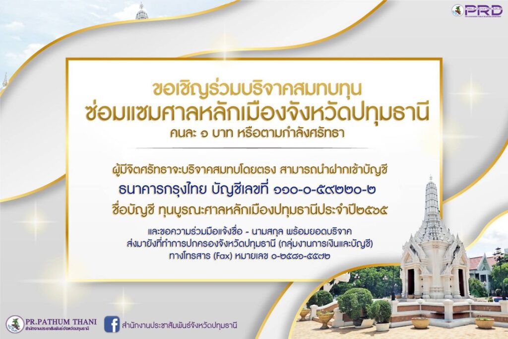 ขอเชิญผู้มีจิตศรัทธาร่วมบูรณะซ่อมแซมศาลหลักเมืองจังหวัดปทุมธานี สามารถบริจาคสมทบทุนคนละ 1 บาท หรือตามกำลังศรัทธาเปิดรับบริจาคตั้งแต่วันที่ 1 กรกฎาคม ถึง 25 สิงหาคม 2565 หรือบริจ่าคโดยตรงที่ทำการปกครองจังหวัดปทุมธานี (กลุ่มงานเงินและบัญชี) ศาลากลางจังหวัดปทุมธานี หรือบัญชีเงินฝากธนาครกรุงไทย สาขาปทุมธานี ประเภทออมทรัพย์ บัญชีเลขที่ 110-0-59220-2 ชื่อบัญชี ทุนบูรณะศาลหลักเมืองปทุมธานี ประจำปี 2565 และขอความร่วมมือแจ้งชื่อนามสกุลพร้อมยอดเงินบริจาคมายังที่ทำการปกครองจังหวัดปทุมธานี ทางโทรสาร(Fax) 02-581-5572