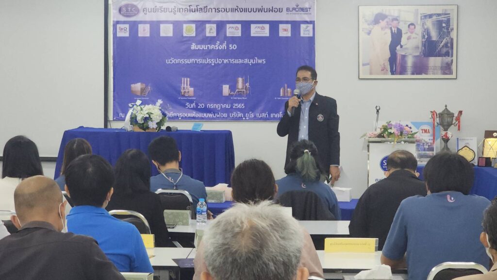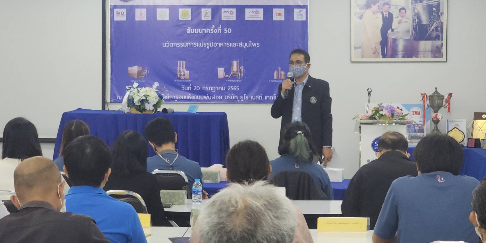 เมื่อเวลา 09.00 น. วันที่ 20 กรกฎาคม 2565 ที่ศูนย์เรียนรู้เทคโนโลยีการอบแห้งแบบพ่นฝอย บริษัทยูโร เบสท์ เทคโนโลยี จำกัด ต.คูคต อ.ลำลูกกา จ.ปทุมธานี ศูนย์ส่งเสริมอุตสาหกรรมภาคที่ 8 กรมส่งเสริมอุตสาหกรรม ร่วมกับ บริษัท ยูโรเบสท์ เทคโนโลยี จำกัด จัดสัมมนานวัตกรรมการแปรรูปอาหารและสมุนไพร ครั้งที่ 50 ขึ้น มีนายสมควร จันทร์แดง ประธานสภาอุตสาหกรรมจังหวัดปทุมธานี เป็นประธานเปิดการสัมมนาหลักสูตร ซึ่งมี นายสาธร เตรียมชัยศรี กรรมการผู้จัดการ และผู้เชี่ยวชาญจากบริษัทยูโร เบสท์ เทคโนโลยี จำกัด นางสาวอุดมรัตน์ วุฒิสาร ผู้อำนวยการกลุ่มบริการธุรกิจอุตสาหกรรม และผู้ประกอบการศูนย์ส่งเสริมอุตสาหกรรมภาคที่ 8 พร้อมทั้งผู้ที่เข้าร่วมสัมมนากว่า 50 คนให้การต้อนรับ