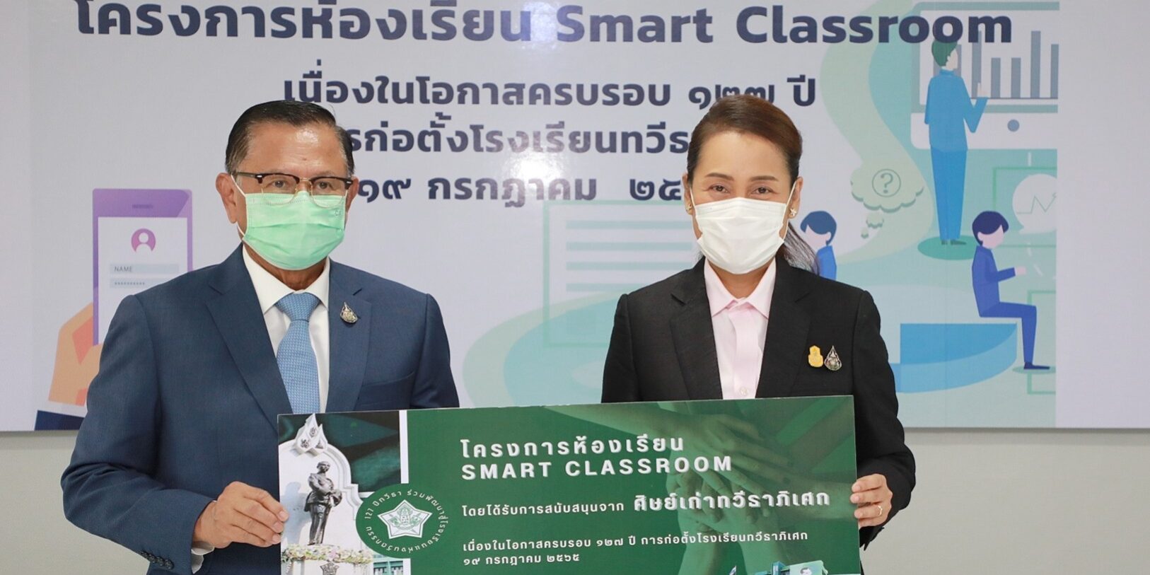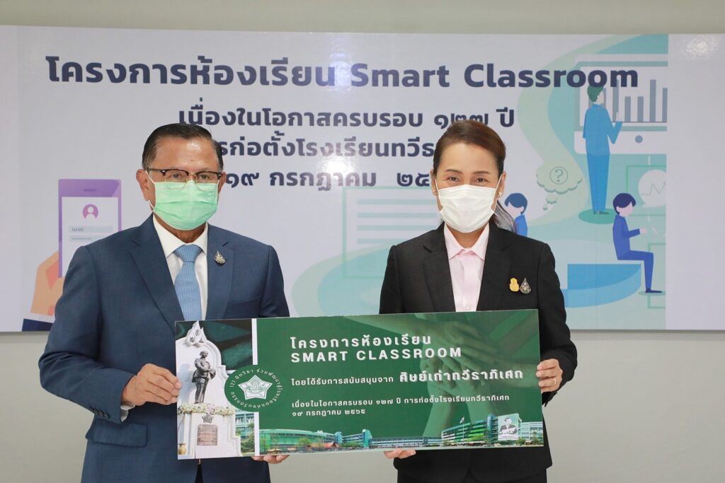 วันที่ 19 กรกฎาคม 2565 เวลา 10.00 น. นางกนกวรรณ วิลาวัลย์ รัฐมนตรีช่วยว่าการกระทรวงศึกษาธิการ เป็นประธานพิธีส่งมอบห้องเรียน Smart Classroom ในโอกาสวันสถาปนาโรงเรียนทวีธาภิเศก ครบรอบ 127 ปี โดยมี พลเอกวัชระ นิตยสุทธิ์ นายกสมาคมศิษย์เก่าโรงเรียนทวีธาภิเศก กล่าวรายงาน มีศิษย์เก่าโรงเรียนทวีธาภิเศกที่ให้การสนับสนุนทุน ได้แก่ นายศุภชัย สมเจริญ รองประธานวุฒิสภา คนที่สอง นายมนต์ชัย เดโชจรัสศรี นายกสมาคมผู้ปกครองและครูโรงเรียนทวีธาภิเศก พลอากาศโทจุลจรูญ แสงงำพาล ที่ปรึกษาคณะทำงานทางการเมืองประธานสภาผู้แทนราษฎร นายธัชสกล พรหมจมาศ ที่ปรึกษาประจำประธานกรรมการการเลือกตั้ง นายวิรัตน์ ภัทรเมธากุล กรรมการผู้จัดการ บริษัท ภัทรเมธากิจ จำกัด ทั้งนี้ มีนายประจวบ อินทรโชติ ผู้อำนวยการโรงเรียนทวีธาภิเศก ผู้บริหารสถานศึกษาและโรงเรียน คณะครู และนักเรียน เข้าร่วมพิธี ณ อาคาร 2 โรงเรียนทวีธาภิเศก กรุงเทพฯ