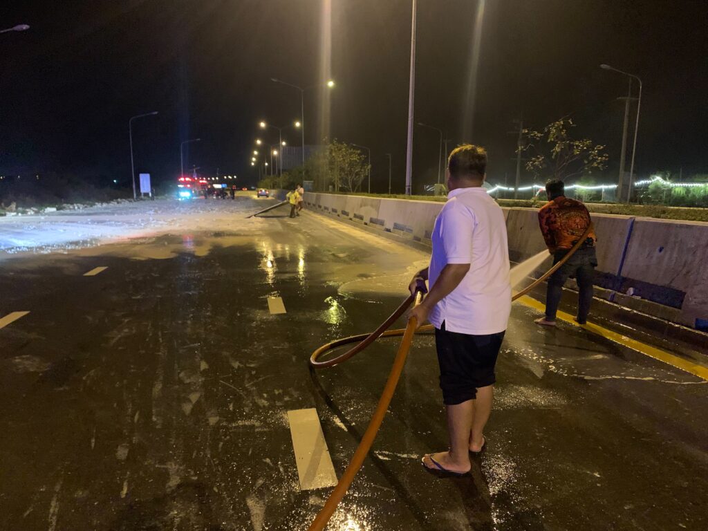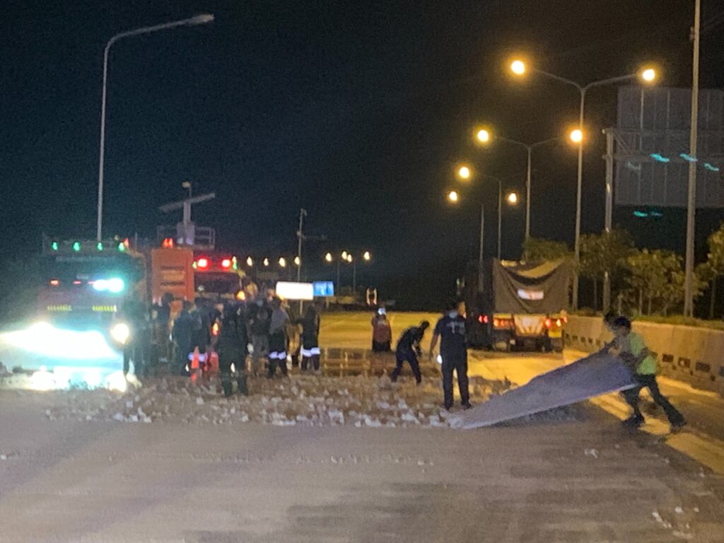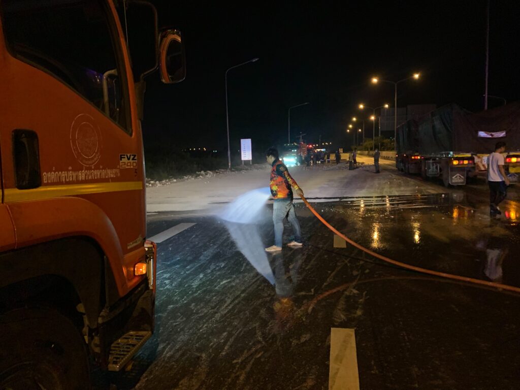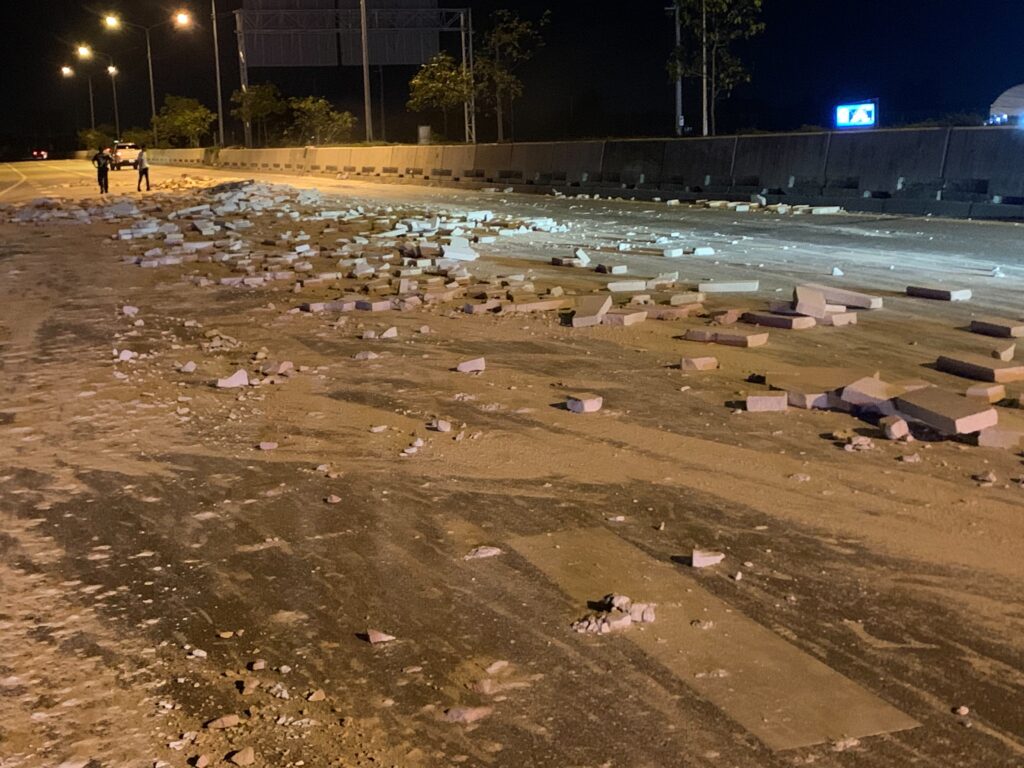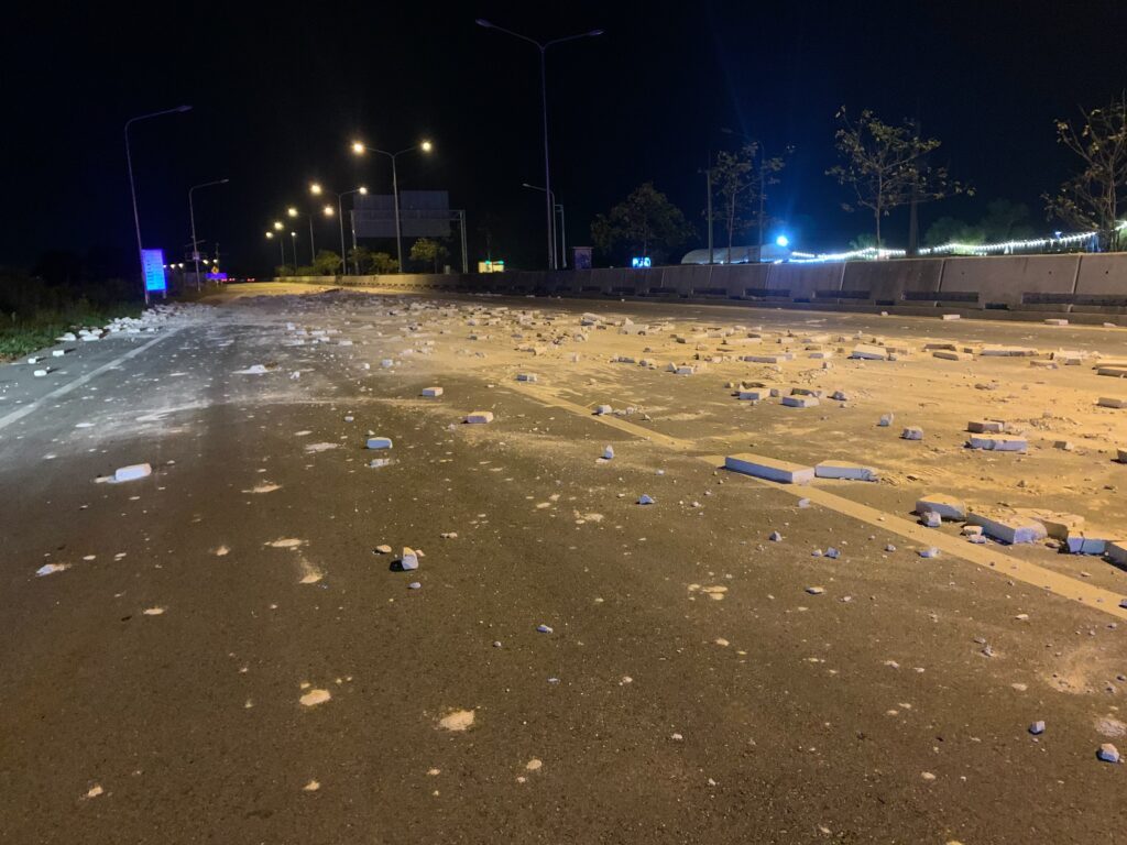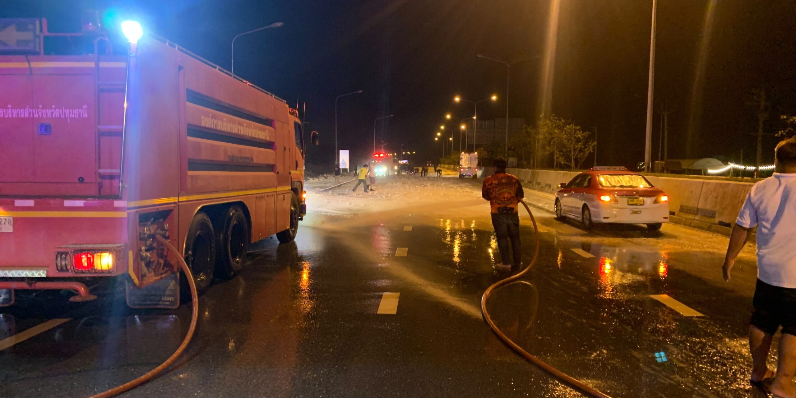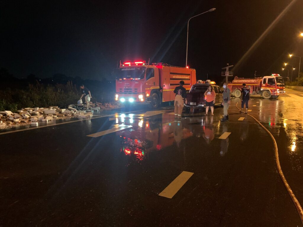 ที่เกิดเหตุอยู่บนถนนราชพฤกษ์ใกล้เคียงแยก อบจ.ปทุมธานี ต.บางหลวง อ.เมืองปทุมธานี พบอิฐมวลเบาจำนวนมากหล่นเกลื่อนถนนกีดขวางการจราจรทุกช่องทาง ชุดเวรปฏิบัติการ กองป้องกันและบรรเทาสาธารณภัยฯ องค์การบริหารส่วนจังหวัดปทุมธานี กว่า 20 คน ลงพื้นที่ติดตั้งไฟสัญญาณแจ้งเตือน พร้อมทั้งนำเครื่องมือต่างๆ ดำเนินการเก็บเศษอิฐมวลเบาทั้งหมดออกจากพื้นถนน จากนั้นได้นำรถบรรทุกน้ำทำการฉีดล้างถนน เพื่อป้องกันการเกิดอุบัติเหตุจากเศษอิฐมวลเบา ที่อาจตกค้างอยู่ โดยใช้เวลาในการดำเนินการกว่า 3 ชัวโมง จึงเสร็จสิ้น สามารถเปิดช่องการจราจรได้เป็นปกติ