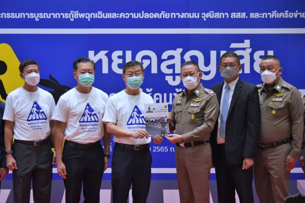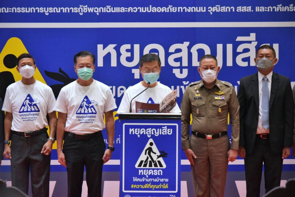 นายสุรชัย เลี้ยงบุญเลิศชัย สมาชิกวุฒิสภา และประธานคณะกรรมการบูรณาการกู้ชีพฉุกเฉินและความปลอดภัยทางถนน วุฒิสภา กล่าวว่า “รัฐบาลได้ตั้งเป้าหมายลดการเสียชีวิตจากอุบัติเหตุทางถนนลงให้เหลือไม่เกิน 12 คนต่อประชากรแสนคน ภายในปี 2570 โดยใช้แนวคิดเน้นการจัดการเชิงระบบวิถีแห่งความปลอดภัย (Safe System Approach) โดยระบบที่ปลอดภัยจะช่วยป้องกัน และลดความสูญเสีย ซึ่งกว่า 6 เดือนที่ผ่านมา กิจกรรม หยุดสูญเสีย หยุดรถ ให้คนข้ามทางม้าลาย ขับเคลื่อนทำงานรณรงค์ปลูกจิตสำนึกอย่างต่อเนื่อง เพื่อสร้างวินัยจราจร วันนี้เรายังเดินหน้ารณรงค์อย่างต่อเนื่องเพื่อสร้างความมั่นใจให้คนข้ามทางม้าลาย การจัดกิจกรรมครั้งนี้ ได้ร่วมกับ สำนักงานตำรวจแห่งชาติ ซึ่งเป็นหน่วยงานสำคัญยิ่งที่มีหน้าที่กำกับดูแล บังคับใช้กฎหมาย จึงมีข้อเสนอเชิงนโยบายเสนอต่อผู้บัญชาการตำรวจแห่งชาติเพื่อพิจารณาให้เกิดความปลอดภัย 3 ด้าน คือ