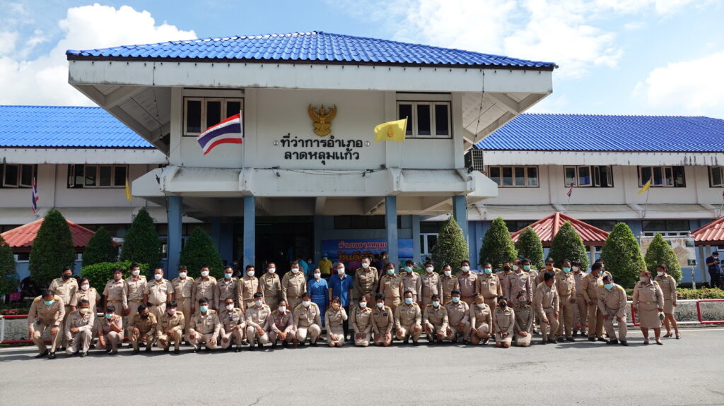 เมื่อเวลา 10.00 น. วันที่ 22 กรกฎาคม 2565 ที่ว่าการอำเภอลาดหลุมแก้ว จังหวัดปทุมธานี นายธนาคม จงจิระ อธิบดีกรมการปกครอง และคณะผู้บริหาร ได้ลงพื้นที่ตรวจติดตามการขับเคลื่อนโครงการสำคัญของกรมการปกครอง 10 Flagships to DOPA All Smart 2022 และตรวจติดตามการขับเคลื่อนศูนย์อำนวยการขจัดความยากจนและพัฒนาคนทุกช่วงวัยอย่างยั่งยืนตามหลักปรัชญาของเศรษฐกิจพอเพียง (ศจพ.) พร้อมทั้งตรวจเยี่ยมให้กำลังใจและประชุมมอบนโยบายแนวทางการปฏิบัติราชการให้แก่พี่น้องฝ่ายปกครอง นายอำเภอ ปลัดอำเภอ ข้าราชการ และกำนัน ผู้ใหญ่บ้าน โดยมีนางรัฐยา อาจหาญ เผยพร นายอำเภอลาดหลุมแก้ว พร้อมด้วยปลัดอำเภอ หัวหน้าส่วนราชการ และกำนัน ผู้ใหญ่บ้าน ให้การต้อนรับ