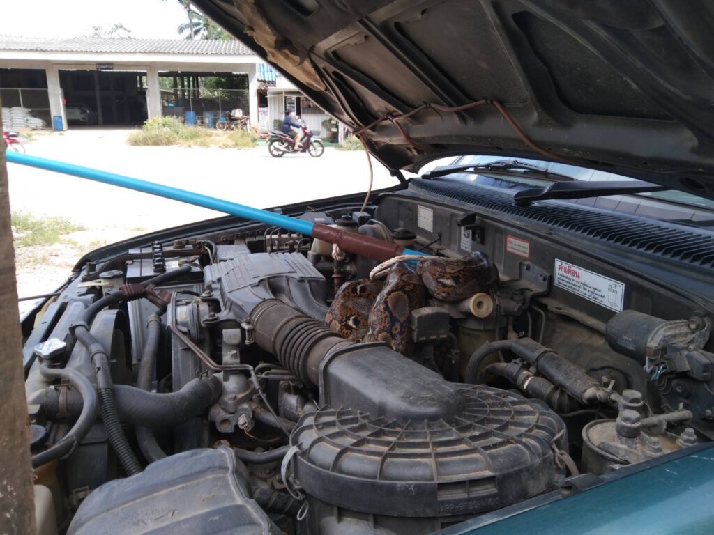 นาย สมพงศ์ ขุนศักดิ์ เจ้าของรถ เปิดเผยทีมข่าวว่า รถกระบะนี้ เป็นรถที่มักจะใช้เข้าสวนเกษตร สวนยาง สวนปามล์ และจอดทิ้งไว้ ซึ่งเป็นไปได้ว่า งูเหลือมตัวใหญ่ น่าจะเลื้อยคลานเข้ามานอนซุกใต้ห้องเครื่องยนต์ และนับว่าโชคดี ที่วันนี้ต้องเอารถมาเปลี่ยนใส่น้ำมันเบรก เพราะรถวิ่งทำงาน เพื่อความปลอดภัย จึงนำมาเข้าที่อู่ พอเปิดจึงได้พบงูเหลือม โชคดีที่ไม่ได้เลื้อยเข้ามากัด แต่นับว่าเป็นโชคดี เหมือนเจองูเหลือมในรถของตน แปลว่ากำลังใช้โชคลาภ สิ้นเดือนนี้ต้องส่องเลขนี้ ซื้อหวยเลขป้ายทะเบียนนี้แล้ว