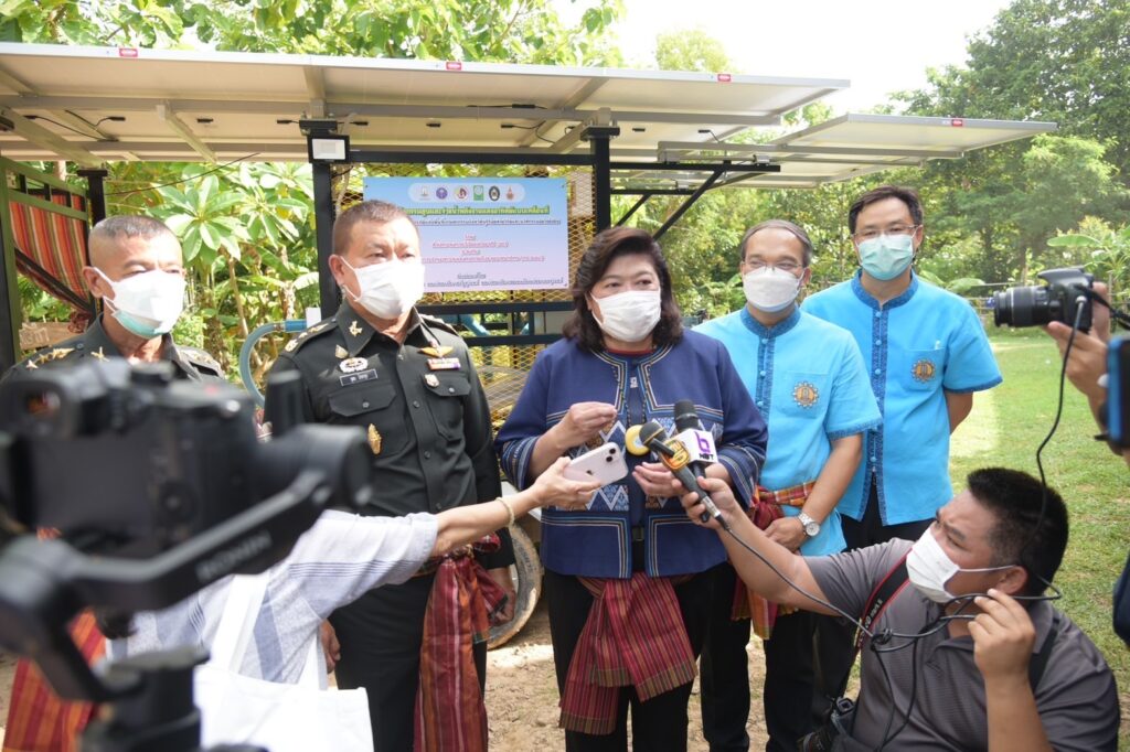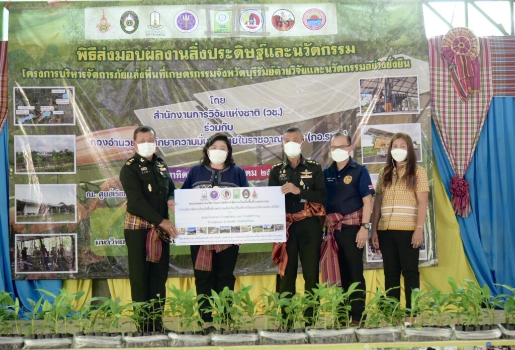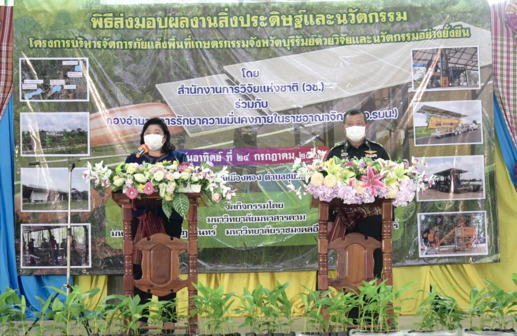 ดร.วิภารัตน์ ดีอ่อง ผู้อำนวยการสำนักงานการวิจัยแห่งชาติ (วช.) กล่าวว่า (วช.) ภายใต้กระทรวง (อว.) เล็งเห็นถึงความร่วมมือระหว่างภาคการวิจัยและภาคความมั่นคง ในการเชื่อมต่องานวิจัยและนวัตกรรมเพื่อการแก้ไขปัญหาให้ภาคประชาชน ซึ่งเป็นความร่วมมือระหว่าง (วช.) และ (กอ.รมน.) ในการใช้ประโยชน์องค์ความรู้จากผลงานวิจัยและนวัตกรรมเพื่อการพัฒนาเชิงพื้นที่ ตามแนวคิด “ชุมชนเข้มแข็ง ด้วยวิจัยและนวัตกรรม” ซึ่งจะเป็นการส่งมอบผลงานวิจัยและนวัตกรรมในโครงการเรื่อง “การบริหารจัดการภัยแล้งพื้นที่เกษตรกรรมจังหวัดบุรีรัมย์ด้วยวิจัยและนวัตกรรมอย่างยั่งยืน” โดย (วช.) ได้ให้การสนับสนุนองค์ความรู้ เทคโนโลยี นวัตกรรมเพื่อการบริหารจัดการภัยแล้งพื้นที่เกษตรกรรม ผ่าน 4 กิจกรรมหลัก 12 นวัตกรรม ที่พัฒนาโดยทีมคณะนักวิจัยจากมหาวิทยาลัยมหาสารคาม ร่วมกับ มหาวิทยาลัยราชภัฏสุรินทร์ และมหาวิทยาลัยเทคโนโลยีราชมงคลอีสาน วิทยาเขตสุรินทร์ เพื่อการเพิ่มประสิทธิภาพในกระบวนการผลิต การยกระดับคุณภาพชีวิตของเกษตรกรและประชาชนในพื้นที่ตำบลชุมแสง อำเภอสตึก จังหวัดบุรีรัมย์ให้สูงขึ้น และที่สำคัญยิ่งคือ ความร่วมมือร่วมใจของพี่น้องชาวตำบลชุมแสงและพื้นที่ข้างเคียง ตลอดจน กำนัน ผู้ใหญ่บ้าน ผู้นำชุมชน ปราชญ์ชาวบ้าน ปราชญ์ชุมชน ที่ร่วมมือกันจนสำเร็จลุล่วงไปได้ด้วยดี