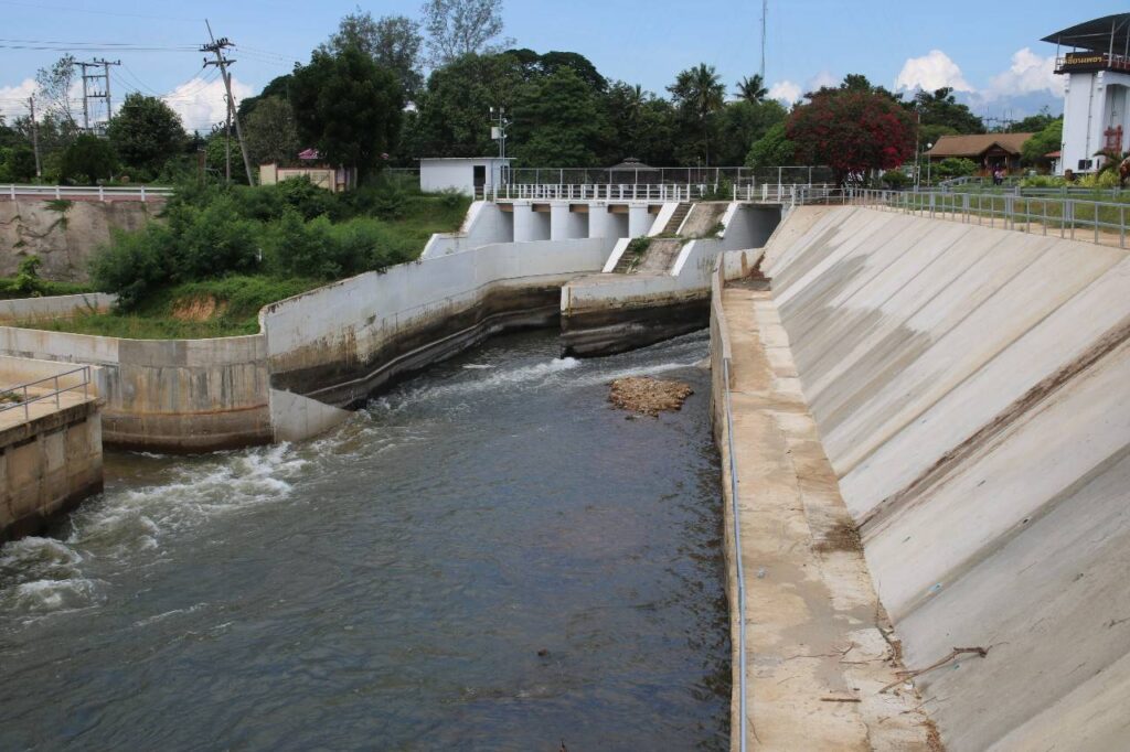 3) การก่อสร้างประตูควบคุมน้ำ ออกแบบเพื่อให้ระบายน้ำในช่วงน้ำหลาก และกักเก็บน้ำจืดไว้ใช้ในช่วงหน้าแล้ง โดยออกแบบ ให้มีประตูควบคุมน้ำ 5 บาน กว้างบานละ 8 เมตร มีอัตราการไหลของน้ำ (Qd) เท่ากับ 350 ลูกบาศก์เมตรต่อวินาที