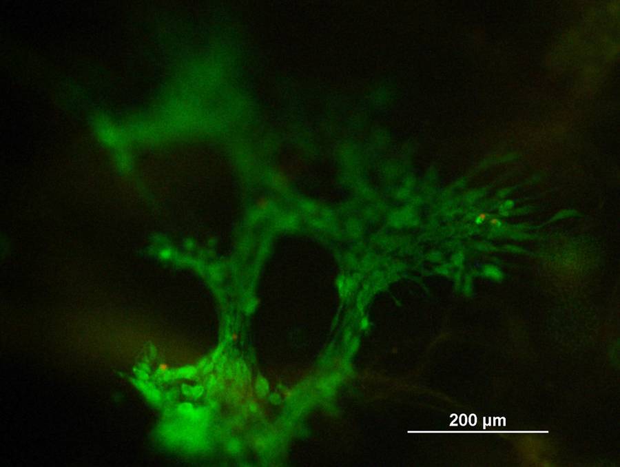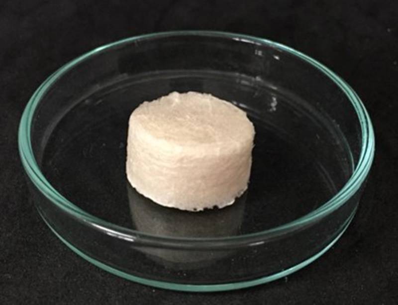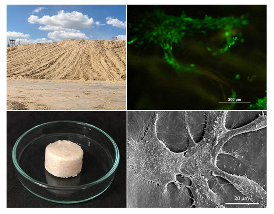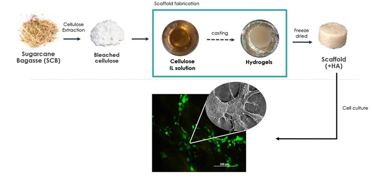 รศ.ดร.ประกิต สุขใย จากภาควิชาเทคโนโลยีชีวภาพ คณะอุตสาหกรรมเกษตร มหาวิทยาลัยเกษตรศาสตร์ กล่าวว่า โครงการวิจัยนี้เกิดจากแนวคิดในการสร้างผลิตภัณฑ์มูลค่าสูงจากเซลลูโลสที่เป็นองค์ประกอบหลักในชานอ้อย ทีมวิจัยฯ จึงเริ่มศึกษาการใช้ประโยชน์เซลลูโลสสำหรับวัสดุชีวการแพทย์ (Biomedical material) ซึ่งเป็นผลิตภัณฑ์มูลค่าสูง โดยศึกษาการผลิตโครงเลี้ยงเซลล์ฐานเซลลูโลส (Cellulose based scaffold) จากการละลายเซลลูโลสด้วยของเหลวไอออนิก“ ในการผลิตโครงเลี้ยงเซลล์นั้นจะเริ่มตั้งแต่การนำชานอ้อยที่ผ่านกระบวนการปรับสภาพด้วยการระเบิดด้วยไอน้ำและการฟอกขาว ผลผลิตที่ได้จากขั้นตอนนี้คือ เซลลูโลส ซึ่งจะทำการละลายเซลลูโลสร้อยละ 3 โดยน้ำหนัก ด้วยของเหลวไอออนิก (Ionic liquid) ที่อุณหภูมิ 80 องศาเซลเซียส เป็นเวลา 7 ชั่วโมง เติมไฮดรอกซีแอปาไทต์ ซึ่งเป็นวัสดุเชิงหน้าที่สำหรับช่วยกระตุ้นการเจริญเติบโตของเซลล์กระดูกที่มีความปลอดภัยสูง และช่วยส่งเสริมการเจริญเติบโตของเซลล์กระดูก หลังจากการละลายนำไปเก็บที่อุณหภูมิ 4 องศาเซลเซียส 12 ชั่วโมง เพื่อให้เกิดการฟอร์มตัวเป็นไฮโดรเจล (Hydrogel) ทำการล้างเพื่อกำจัดของเหลวไอออนิก และทำแห้งด้วยการทำแห้งแบบแช่เยือกแข็ง (Freeze drying)” งานวิจัยนี้เป็นต้นแบบเพื่อแสดงให้เห็นถึงการเพิ่มมูลค่าให้กับผลพลอยได้ที่เกิดจากอุตสาหกรรมน้ำตาลในประเทศไทย โดยเป็นทางเลือกให้กับอุตสาหกรรมเพื่อออกจากแนวปฏิบัติในการใช้ประโยชน์แบบเดิมก่อให้เกิดผลิตภัณฑ์มูลค่าสูงอื่นๆ โดยจากงานวิจัยนี้นอกจากผลผลิตสุดท้ายคือ โครงเลี้ยงเซลล์แล้ว ยังได้ผลิตภัณฑ์ขั้นต้นคือ เซลลูโลสที่จัดเป็นไฟเบอร์ที่มีประโยชน์และสามารถดัดแปรงไปเป็นอนุพันธ์อื่นๆ ที่มีมูลค่าสูงได้เช่นเดียวกัน