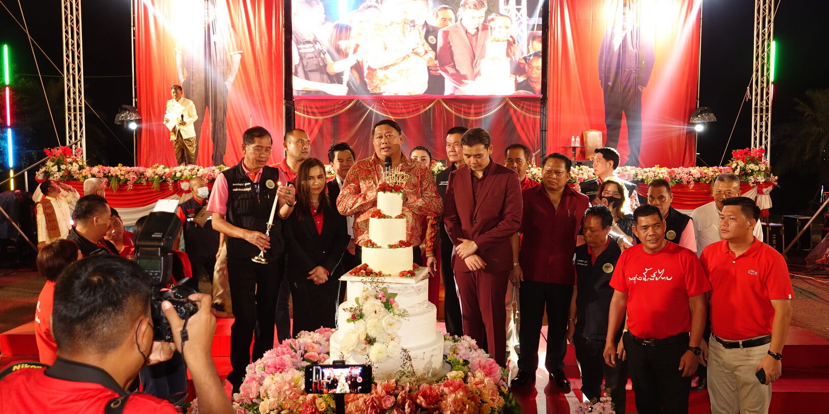 พร้อมกันนี้เหล่านายกเทศมนตรี และ นายกอบต.พร้อมผู้บริหารและกำนันผู้ใหญ่บ้าน ผู้นำชุมชน ได้ทยอยขึ้นเวทีรวมอวยพรวันเกิดก่อนที่จะร่วมเป่าเค้กวันเกิดและจุดพุฉลองกันอย่างตระการตา ภายในงานเลี้ยงอาหารโต๊ะจีนและซุ้มอาหารจากผู้นำชุมชนต่างๆนำมาร่วมงานกันอย่างคับคั่ง เพื่อเป็นการตอบแทนเนื่องจากที่ผ่านมาจ่ายุทธและทีมงานได้ลงพื้นที่ลงไปช่วยเหลือความเดือดร้อนของชุมชนต่างๆ มาอย่างต่อเนื่อง.