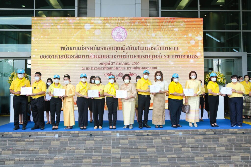 วันนี้ (27 ก.ค. 65) เวลา 09.00 น. นางพัชรี อาระยะกุล ปลัดกระทรวงการพัฒนาสังคมและความมั่นคงของมนุษย์ (ปลัด พม.) เป็นประธานในพิธีเปิดโครงการเทิดไท้องค์ราชัน เพื่อเฉลิมพระเกียรติพระบาทสมเด็จพระเจ้าอยู่หัว เนื่องในโอกาสวันเฉลิมพระชนมพรรษา วันที่ 28 กรกฎาคม 2565 พร้อมทั้งแสดงความจงรักภักดีและน้อมสำนึกในพระมหากรุณาธิคุณทรงปฏิบัติพระราชกรณียกิจนานัปการ เพื่อประโยชน์สุขของพสกนิกรชาวไทย พร้อมทั้งมอบความช่วยเหลือเป็นทุนและอุปกรณ์ประกอบอาชีพให้กลุ่มเปราะบาง และปล่อยขบวนรถคาราวานลงพื้นที่ทำกิจกรรมจิตอาสาในพื้นที่ กทม. โดยมีนายอนุกูล ปีดแก้ว อธิบดีกรมพัฒนาสังคมและสวัสดิการ กล่าวรายงาน ทั้งนี้ มีคณะผู้บริหาร ข้าราชการ และเจ้าหน้าที่กระทรวง พม. ร่วมงาน ณ กระทรวงการพัฒนาสังคมและความมั่นคงของมนุษย์ (พม.) สะพานขาว กรุงเทพฯ