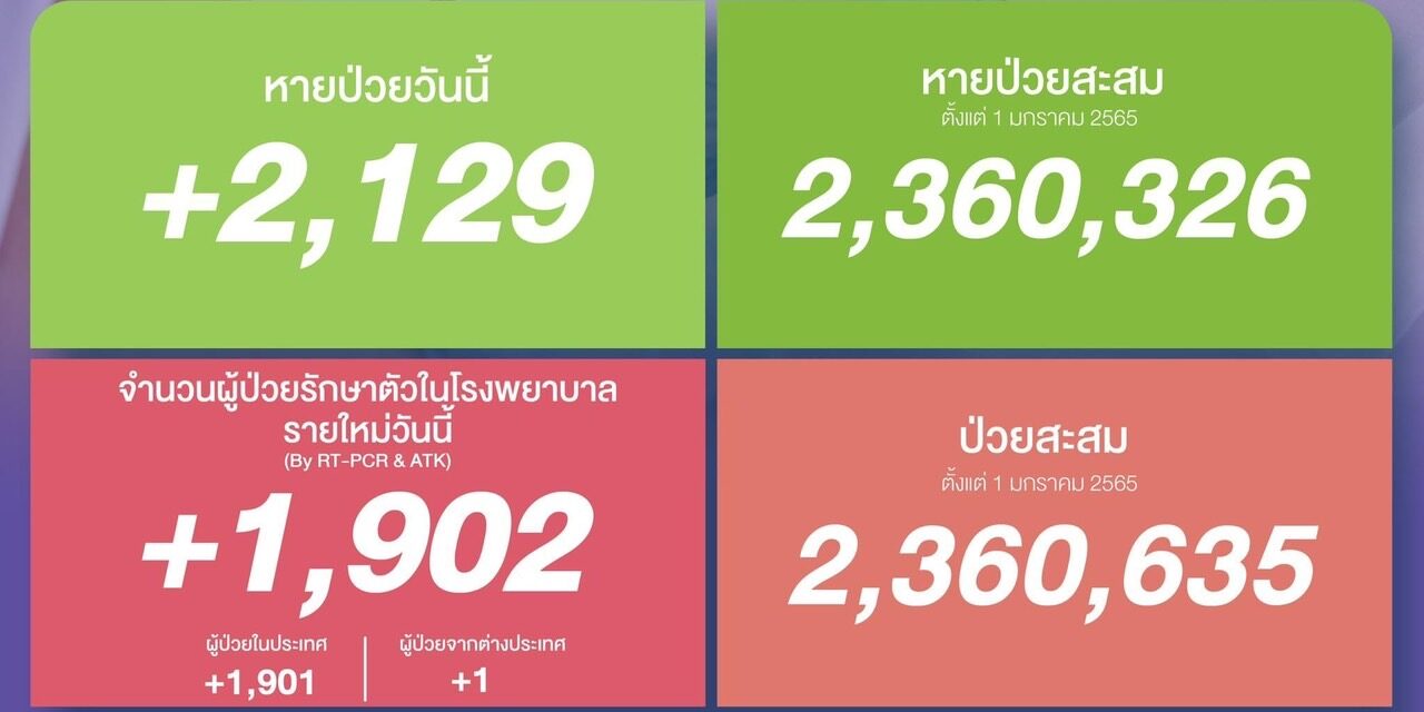 หายป่วยสะสม 2,360,326 ราย (ตั้งแต่ 1 มกราคม 2565)