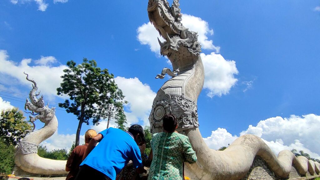 ผู้สื่อข่าวรายงานว่า ที่บริเวณ ทางเข้าวัดวังไทรทองวราราม หมู่ 7 ต.ซับเปิบ อ.วังโป่ง จ.เพชรบูรณ์ ซึ่งเป็นที่ตั้งของ องค์พญานาค ทั้ง 2 ตน ตั้งเด่นเป็นสง่า ขนาดความยาว กว่า 75 เมตร ได้มีชาวบ้านจำนวนหนึ่ง กำลังช่วยกันจัดเตรียมผลไม้ 9 อย่าง ดอกไม้ ธูปเทียน พร้อมเครื่องเซ่นไหว้ มาตั้งโต๊ะบูชา องค์พญานาค ทั้ง 2 ซึ่งมีนามว่า มังกรฟ้า กับ นาวิน หลังจากก่อนหน้านี้ ชาวบ้านรายหนึ่ง ได้เดินทางมากราบไหว้ขอพร และพอกลับไปนอนที่บ้าน ได้ฝันเห็นองค์พญานาค มาดลบันดาลให้โชคลาภ พอตื่นเช้ามา จึงตั้งจิตอฐิษฐานขอพร และออกไปซื้อสลากกินแบ่งรัฐบาล ซึ่งพอประกาศผลรางวัล ปรากฎว่า ถูกหวยรางวัลที่3 จำนวน 1 ใบ และเลขหน้า3ตัว จำนวน 1 ใบ ได้เงินรางวัล ประมาณ 84,000 บาท