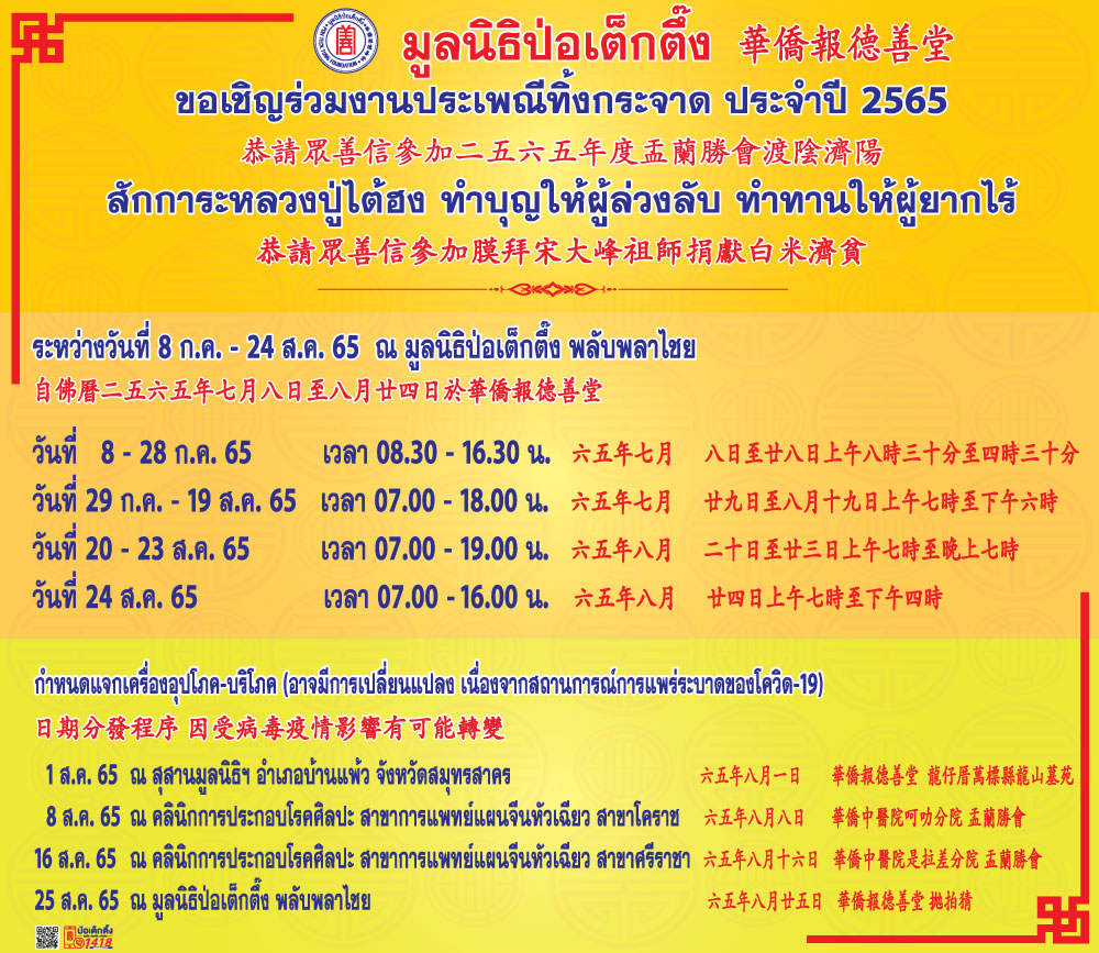 ระหว่างวันที่ 8 กรกฎาคม – 24 สิงหาคม 2565 มูลนิธิป่อเต็กตึ๊ง ขอเชิญชวนประชาชนผู้มีจิตศรัทธาร่วมงานบุญมหากุศลประจำปี “ประเพณีทิ้งกระจาด ประจำปี 2565” สักการะหลวงปู่ไต้ฮง (ไต้ฮงกง) เพื่อความเป็นสิริมงคล ทำบุญชุดข้าวสารให้ผู้ล่วงลับ พร้อมกับเป็นการสมทบทุนข้าวสารและเครื่องอุปโภคบริโภคเพื่อเป็นการทำทานให้ผู้ยากไร้ ในพื้นที่จังหวัดสมุทรสาคร ชลบุรี นครราชสีมา และ 50 เขต กรุงเทพมหานคร รวมทั้งสิ้น 4 จังหวัด (กำหนดการอาจมีการเปลี่ยนแปลงตามสถานการณ์การแพร่ระบาดของโควิด-19)