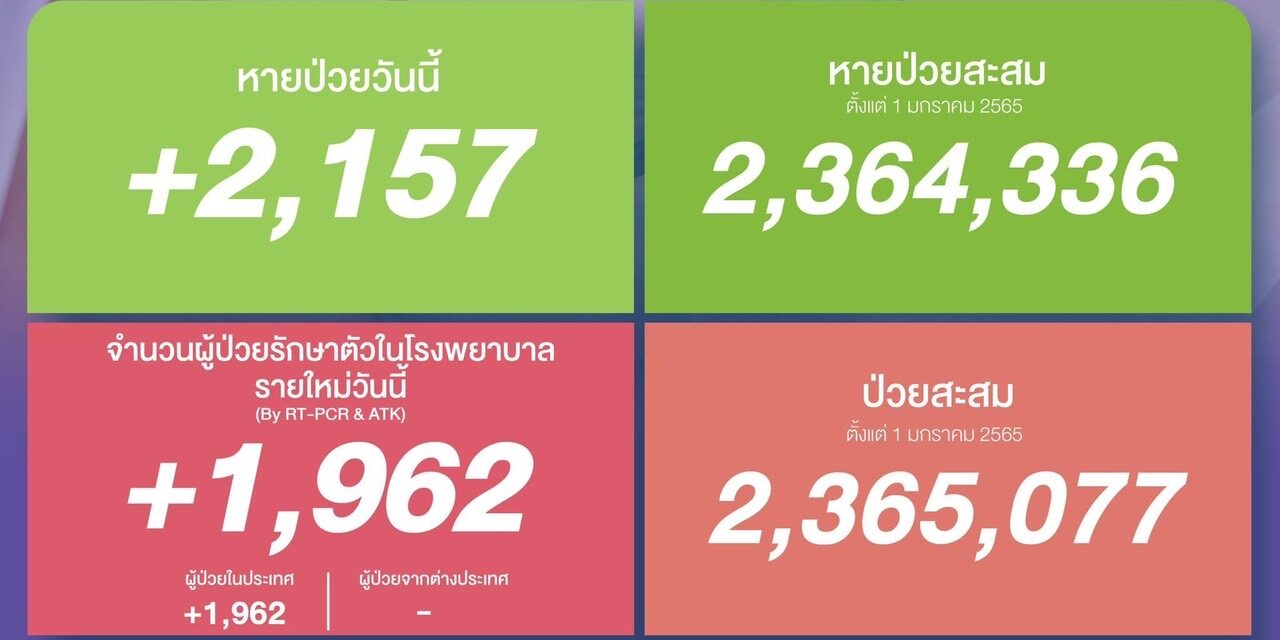หายป่วยสะสม 2,364,336 ราย (ตั้งแต่ 1 มกราคม 2565)