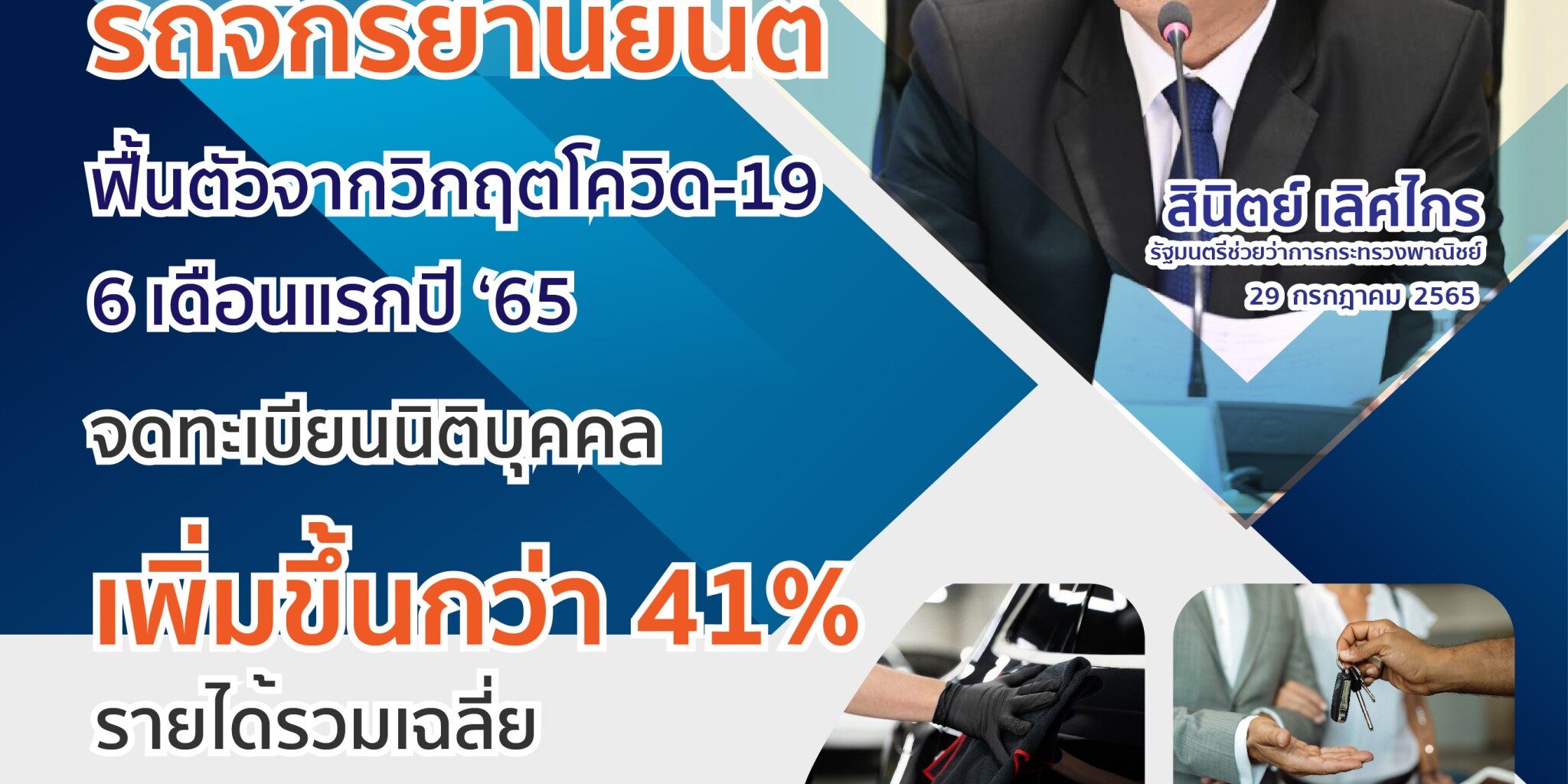 เมื่อวันที่ 29 กรกฎาคม 2565 เวลา 09.00 น. : นายสินิตย์ เลิศไกร รัฐมนตรีช่วยว่าการกระทรวงพาณิชย์ เปิดเผยว่า “ช่วงการแพร่ระบาดของโรคโควิด-19 ระหว่างปี 2563-2564 ธุรกิจประเภทต่างๆ ทั้งในและต่างประเทศล้วนได้รับผลกระทบอย่างหนัก โดยเฉพาะธุรกิจภาคการท่องเที่ยวและที่เกี่ยวข้อง เนื่องจากนักท่องเที่ยวไม่สามารถเดินทางระหว่างประเทศได้ ขณะที่การเดินทางภายในประเทศถูกจำกัดด้วยมาตรการทางสาธารณสุข ทำให้การดำเนินธุรกิจเกิดภาวะหยุดชะงัก ผ่านพ้นถึงปี 2565 โรคโควิด-19 กำลังจะกลายเป็นโรคประจำถิ่น รัฐบาลผ่อนคลายมาตรการเข้มงวดต่างๆ ลง ส่งผลให้การดำเนินธุรกิจทุกภาคส่วนส่งสัญญาณการฟื้นตัวและกลับมาคึกคักอีกครั้ง
