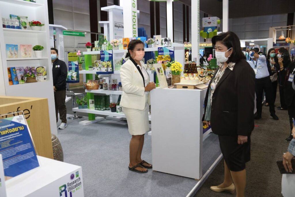 พร้อมเยี่ยมชมนิทรรศการผลงานวิจัยขายได้ ซึ่งมีผลิตภัณฑ์จากผลงานวิจัยที่ขายได้จริง ผลงานวิจัยที่เป็นผลสำเร็จจากหน่วยงานในระบบวิจัยทั่วประเทศ (PMU) และผลงานวิจัยที่ได้รับการสนับสนุนจาก (วช.) และใช้ประโยชน์ เป็นเวทีที่เผยแพร่การดำเนินงานของ (วช.) ในการสนับสนุนและผลักดันงานวิจัยและนวัตกรรมไปสู่การใช้ประโยชน์ได้อย่างเป็นรูปธรรม โดยนำเสนอผลงานวิจัยและนวัตกรรมที่โดดเด่น ของ (วช.) ภายในงานมหกรรม งานวิจัยแห่งชาติ 2565 เพื่อให้กลุ่มเป้าหมาย ผู้ที่สนใจ หรือประชาชนทั่วไปได้รับรู้ ในการดำเนินงาน ของ (วช.) ด้านการส่งเสริม สนับสนุนการวิจัยและนวัตกรรม ตลอดจนองค์ความรู้ต่างๆ ที่ช่วยขับเคลื่อนประเทศให้มี ความเข้มแข็งและสามารถแข่งขันในระดับนานาชาติต่อไปได้ ถือเป็นอีกหนึ่งรูปแบบการประชาสัมพันธ์และ เผยแพร่ผลงานและกิจกรรมของ วช. ไปสู่ชุมชนและสาธารณชนเพื่อให้ได้ทราบและนำไปสู่การใช้ประโยชน์ ต่อไป โดยมีผลงานที่มานำเสนอกว่า 50 ผลงาน ใน 6 ด้าน