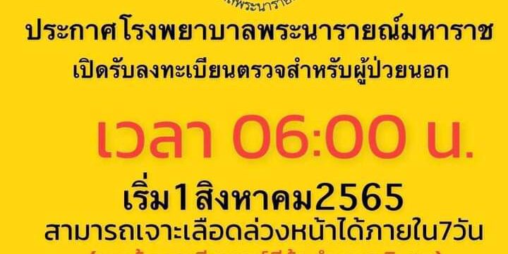 โรงพยาบาลพระนารายณ์มหาราช เปิดรับลงทะเบียนตรวจสำหรับผู้ป่วยนอก เริ่มเวลา 6.00 น. เริ่ม 1 ส.ค. 65