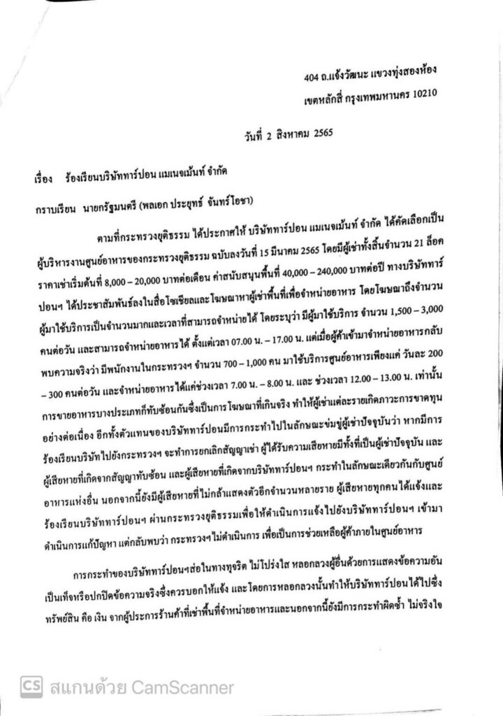 ซึ่งเป็นผู้เช่าพื้นที่เพื่อจำหน่ายอาหารของกระทรวงยุติธรรมที่บริษัท ทาร์ปอน แมเนจเม้นท์ จำกัด มีนายชัชวาลย์ ชินะโปดก เป็นเจ้าของและกรรมการผู้บริหาร ร้องเรียนต่อพล.อ.ประยุทธ์ จันทร์โอชา นายกรัฐมนตรี