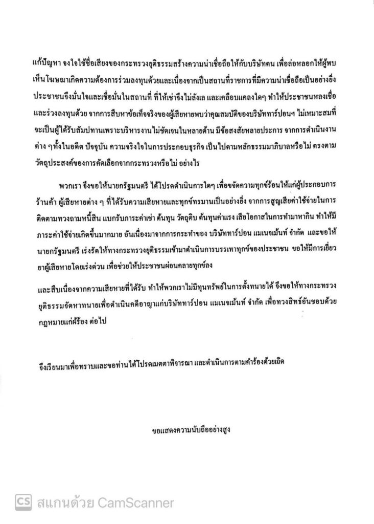 จึงขอให้นายกรัฐมนตรี ช่วยขจัดความทุกข์ร้อนให้ผู้ประกอบการร้านค้า ผู้เสียหายต่าง ๆ ที่ได้รับความทุกข์ทรมานเป็นอย่างยิ่ง จากการสูญเสียค่าใช้จ่ายในการติดตามทวงถามหนี้สิน แบกรับภาระค่าเช่า ต้นทุนวัตถุดิบ ต้นทุนค่าแรง เสียโอกาสในการทำมาหากิน ทำให้มีภาระค่าใช้จ่ายเกิดขึ้นมากมาย อันเนื่องมาจากการกระทำของ บริษัททาร์ปอน แมเนจเม้นท์ จำกัด และขอให้นายกรัฐมนตรี เร่งรัดให้กระทรวงยุติธรรมเข้ามาบรรเทาทุกข์ของประชาชน เยียวยาผู้เสียหายโดยเร่งด่วน ทั้งนี้ผู้ที่ได้รับความเสียหาย ไม่มีทุนจัดหาทนาย จึงขอให้กระทรวงยุติธรรมจัดหาทนายเพื่อดำเนินคดีอาญาแก่บริษัททาร์ปอน แมเนจเม้นท์ จำกัด เพื่อทวงสิทธ์อันชอบด้วยกฎหมายแก่ผู้ร้องต่อไป