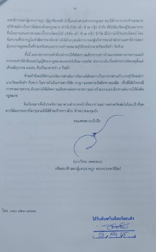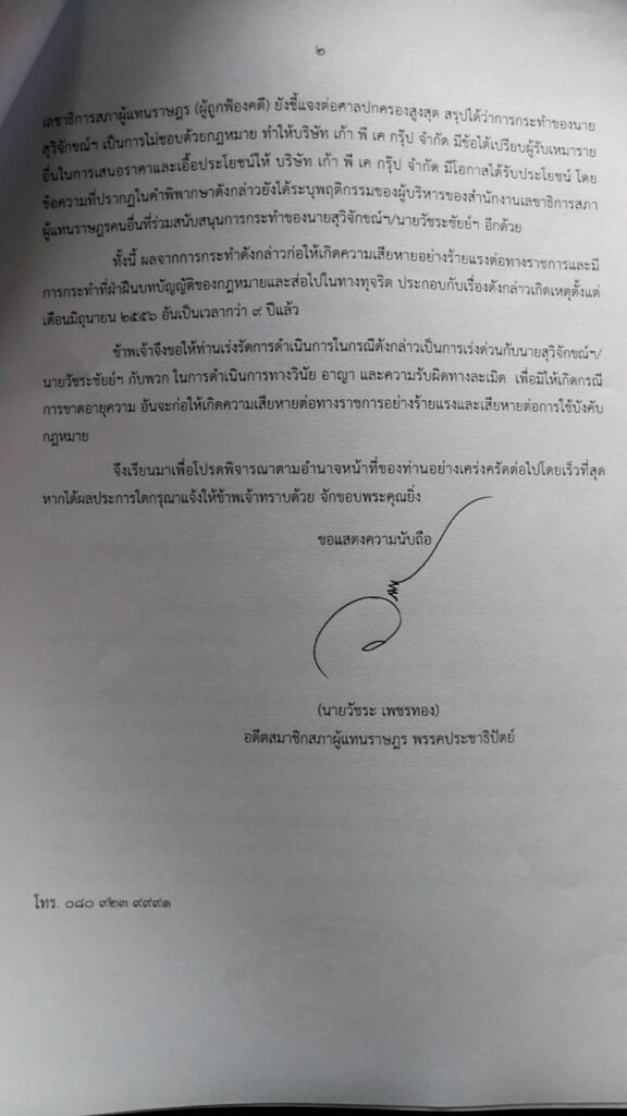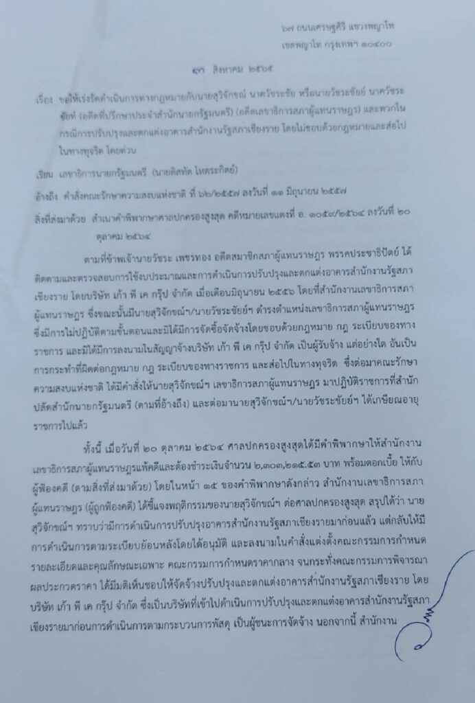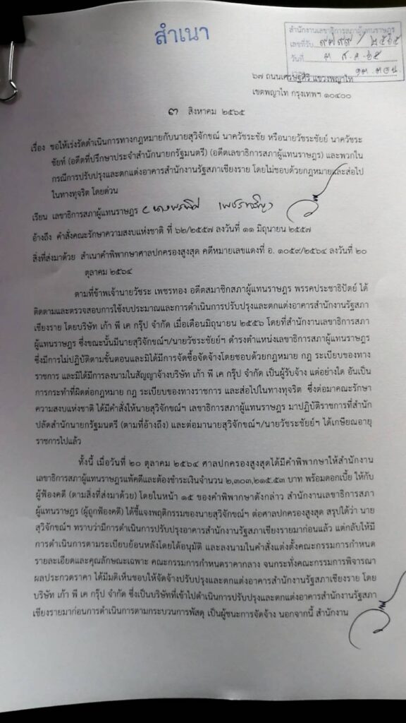นายวัชระ กล่าวว่า ตนได้ติดตามและตรวจสอบการใช้งบประมาณและการดำเนินการปรับปรุงและตกแต่งอาคารสำนักงานรัฐสภา เชียงราย โดยบริษัท เก้า พี เค กรุ๊ป จำกัด เมื่อเดือนมิถุนายน 2556 ซึ่งสำนักงานเลขาธิการสภาผู้แทนราษฎรขณะนั้นมีนายสุวิจักขณ์ หรือ นายวัชระชัยย์ ดำรงตำแหน่งเลขาธิการสภาผู้แทนราษฎร ไม่ปฏิบัติตามขั้นตอนและมิได้จัดซื้อจัดจ้างโดยชอบด้วยกฎหมาย ระเบียบราชการ และมิได้ลงนามในสัญญาจ้างบริษัท เก้า พี เค กรุ๊ป จำกัด ซึ่งเป็นผู้รับจ้างแต่อย่างใด อันเป็นการกระทำที่ผิดต่อกฎหมาย กฎ ระเบียบของทางราชการ และส่อไปในทางทุจริต ซึ่งต่อมาคณะรักษาความสงบแห่งชาติ (คสช.) มีคำสั่งให้นายสุวิจักขณ์ มาปฏิบัติราชการที่สำนักปลัดสำนักนายกรัฐมนตรี จนกระทั่งเกษียณอายุราชการไป ทั้งนี้ เมื่อวันที่ 20 ต.ค.64 ศาลปกครองสูงสุดได้มีคำพิพากษาให้สำนักงานเลขาธิการสภาผู้แทนราษฎรแพ้คดีและต้องชำระเงินจำนวน 2,303,215.53 บาท พร้อมดอกเบี้ย ให้กับผู้ฟ้องคดี โดยในหน้า 15 ของคำพิพากษา สำนักงานเลขาธิการสภาผู้แทนราษฎร (ผู้ถูกฟ้องคดี) ได้ชี้แจงพฤติกรรมของนายสุวิจักขณ์ ต่อศาลปกครองสูงสุด สรุปได้ว่า นายสุวิจักขณ์ ทราบว่ามีการดำเนินการปรับปรุงอาคารสำนักงานรัฐสภาเชียงรายมาก่อนแล้ว แต่กลับให้มีการดำเนินการตามระเบียบย้อนหลังโดยได้อนุมัติ และลงนามในคำสั่งแต่งตั้งคณะกรรมการกำหนด รายละเอียดและคุณลักษณะเฉพาะ คณะกรรมการกำหนดราคากลาง จนกระทั่งคณะกรรมการพิจารณาผลประกวดราคา ได้มีมติเห็นชอบให้จัดจ้างปรับปรุงและตกแต่งอาคารสำนักงานรัฐสภาเชียงราย โดย บริษัท เก้า พี เค กรุ๊ป จำกัด เป็นบริษัทที่เข้าไปดำเนินการก่อนการดำเนินการตามกระบวนการพัสดุ เป็นผู้ชนะการจัดจ้าง นอกจากนี้ สำนักงานเลขาธิการสภาผู้แทนราษฎร (ผู้ถูกฟ้องคดี) ยังชี้แจงต่อศาลปกครองสูงสุด สรุปได้ว่าการกระทำของนายสุวิจักขณ์ เป็นการไม่ชอบด้วยกฎหมาย ทำให้บริษัท เก้า พี เค กรุ๊ป จำกัด มีข้อได้เปรียบผู้รับเหมารายอื่นในการเสนอราคาและเอื้อประโยชน์ให้มีโอกาสได้รับประโยชน์ โดยคําพิพากษาดังกล่าวยังได้ระบุพฤติกรรมของผู้บริหารของสํานักงานเลขาธิการสภาผู้แทนราษฎรคนอื่นที่ร่วมสนับสนุนการกระทำของนายสุวิจักขณ์อีกด้วย