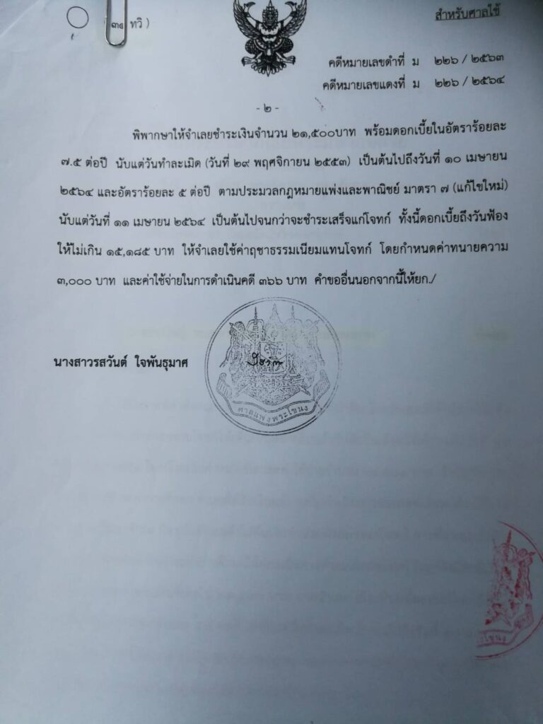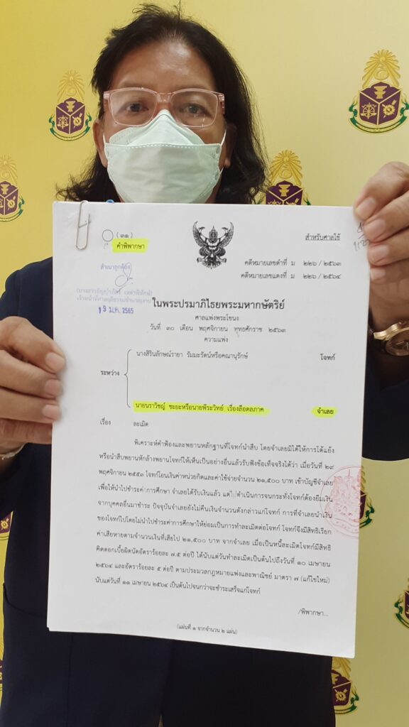 2.นางสิรินลักษณ์รายาได้ฟ้องนายพีระวิทย์ ต่อศาลแพ่งพระโขนงเรื่องละเมิดเพื่อเรียกร้องค่าเสียหายตามจำนวนเงินที่เสียไปจำนวน 21,500 บาท พร้อมดอกเบี้ยและค่าฤชาธรรมเนียม